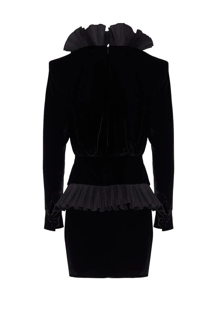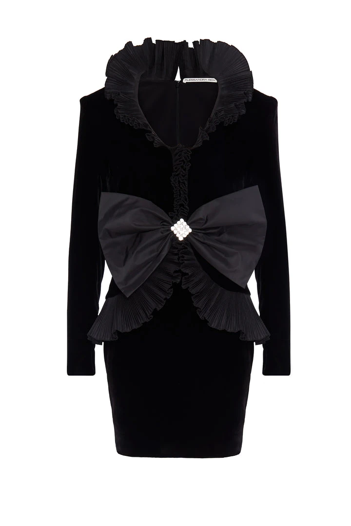 Black textured puff sleeve mini dress from Alessandra Rich featuring a sweetheart neckline, structured shoulders, a frill trim, long sleeves and gathering details. Alessandra Rich employs high-octane details with a feminine twist to elevate this black mini dress. a lace-panelled waist that cinches the wait, then finished with a ruffled peplum overlay and black cotton-blend lining.