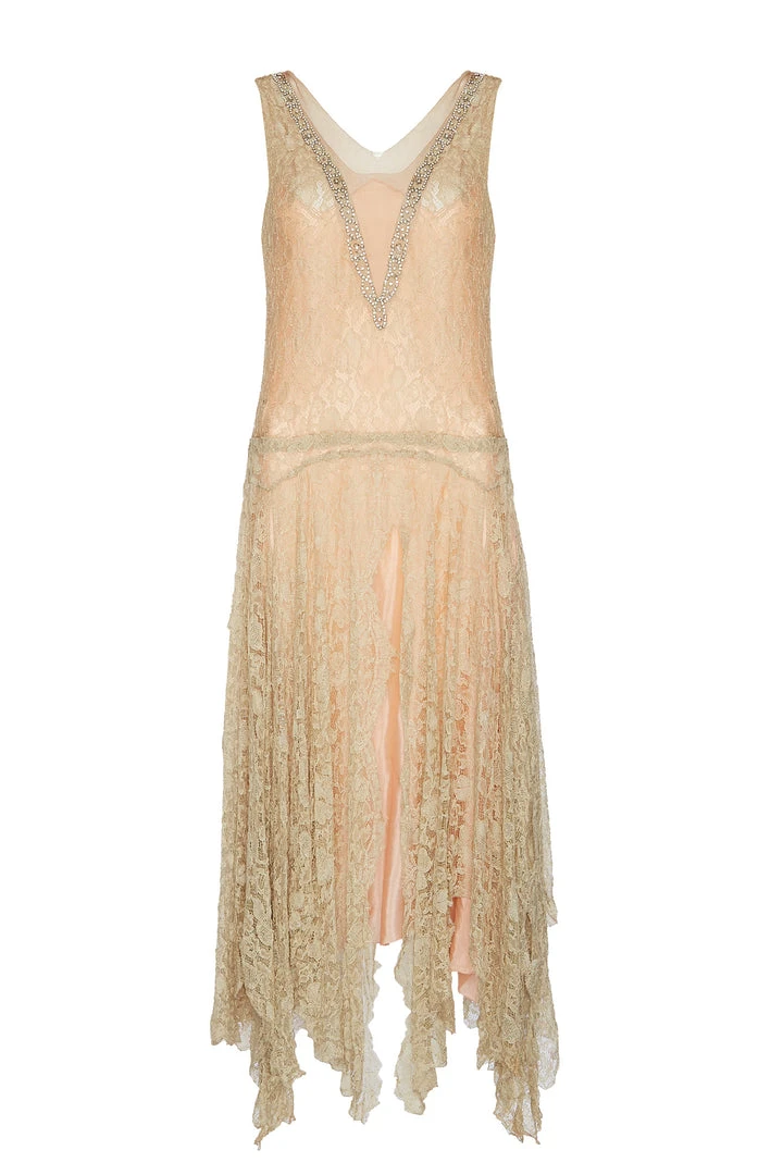 A stunning 1910 flapper girl dress with a deep v-neck encrusted necklace; layered lace fabricÂ