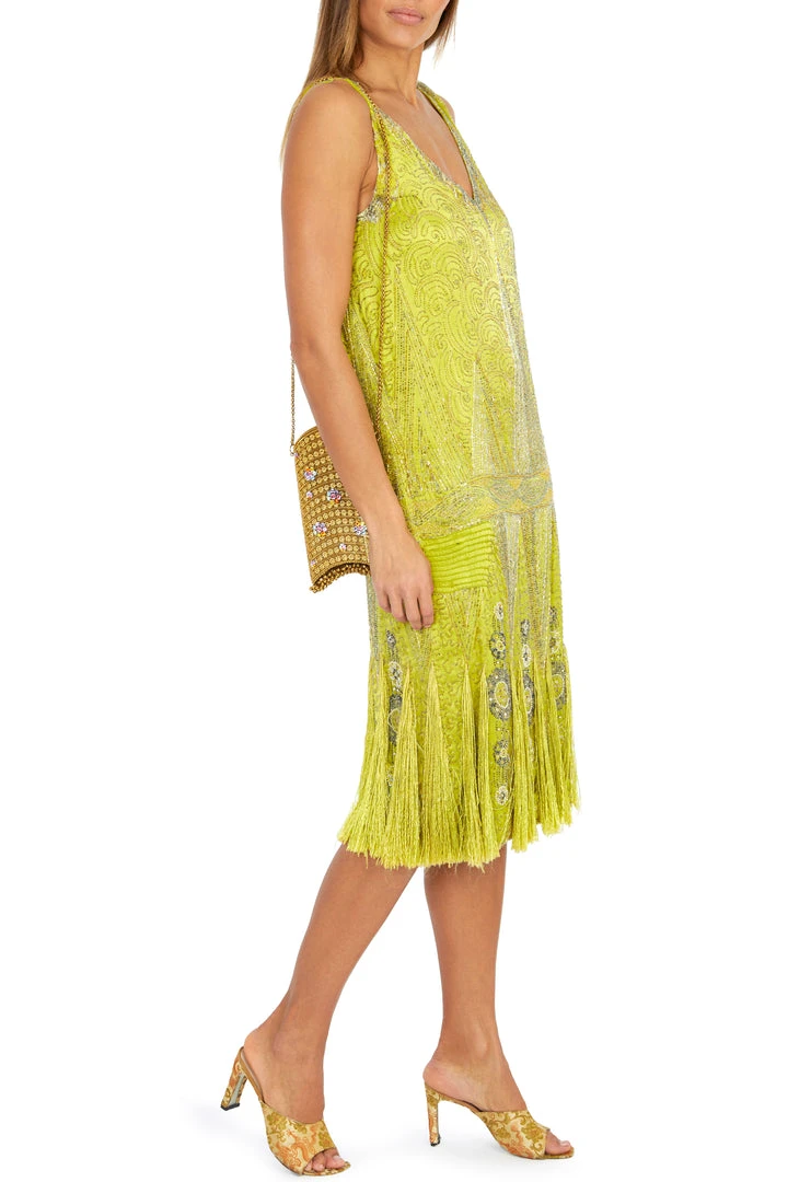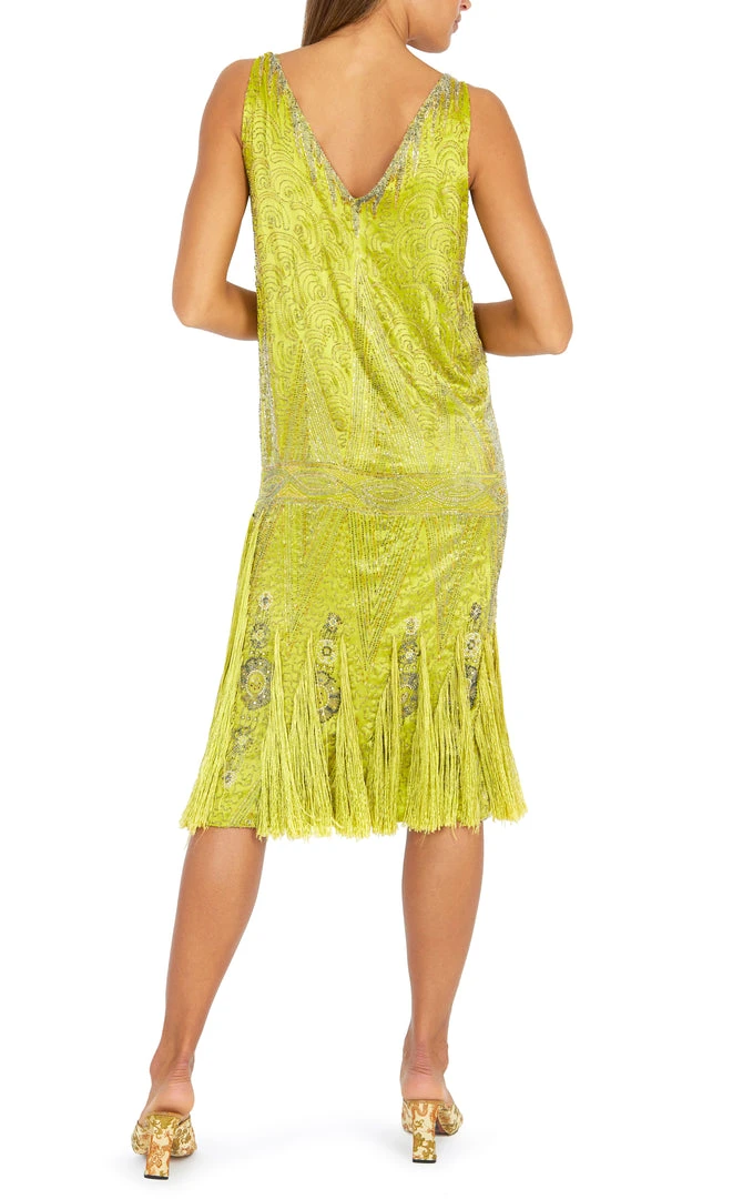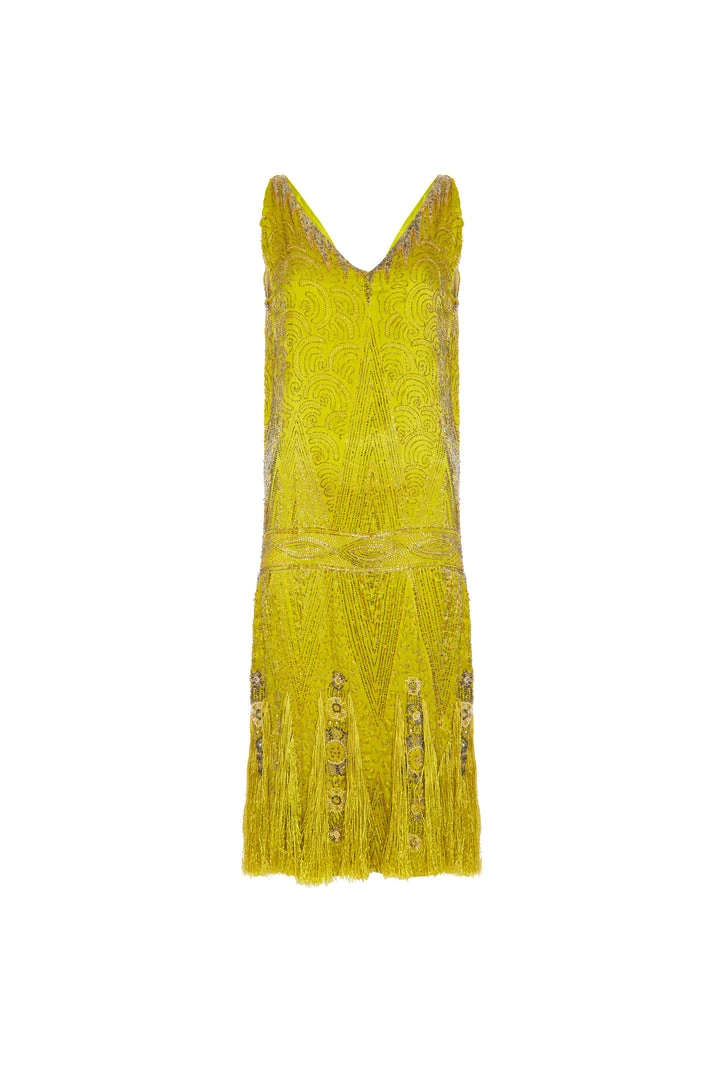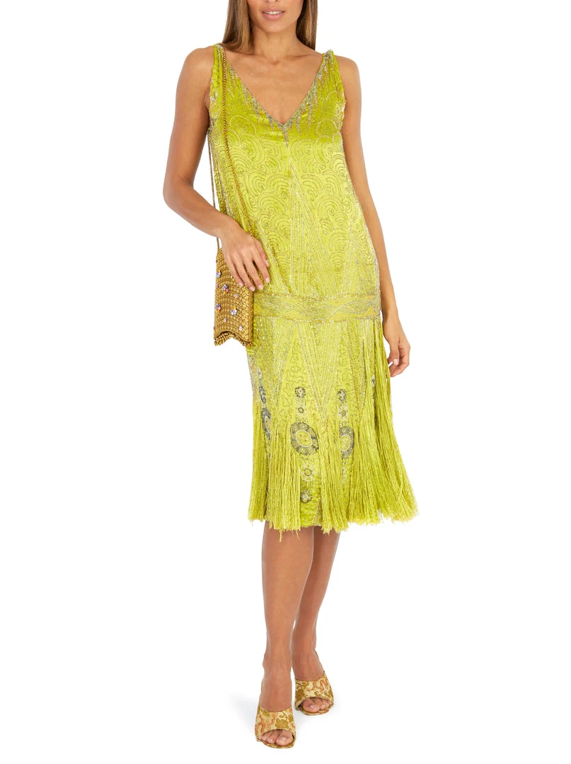 A beaded chartreuse satin flapper dress, late 1920s, – unlabelled, covered with seed and bugle beads, the hem with silk fringes and spangled with rhinestones,
