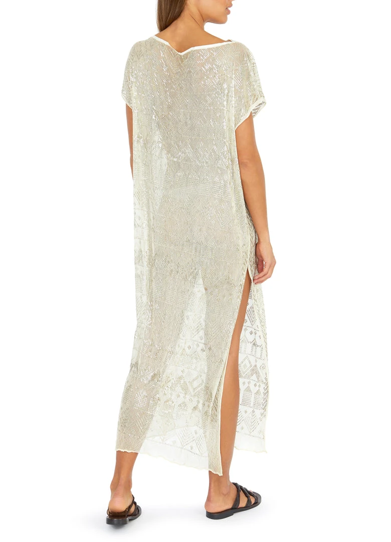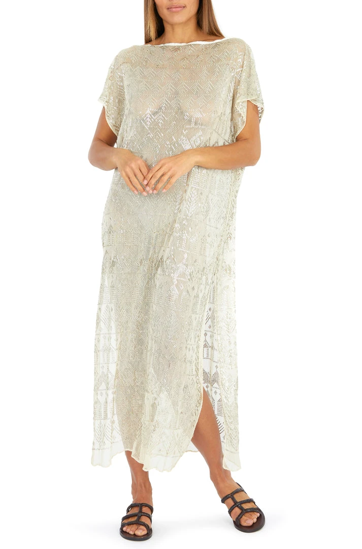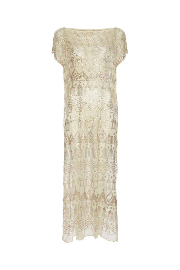 This fabric was first made in the 1920’s in Egypt as a gift for foreigners to bring back as a souvenirs. It was then transformed into a dress including hand beading and was painted using real silver. One of a kind piece!Â