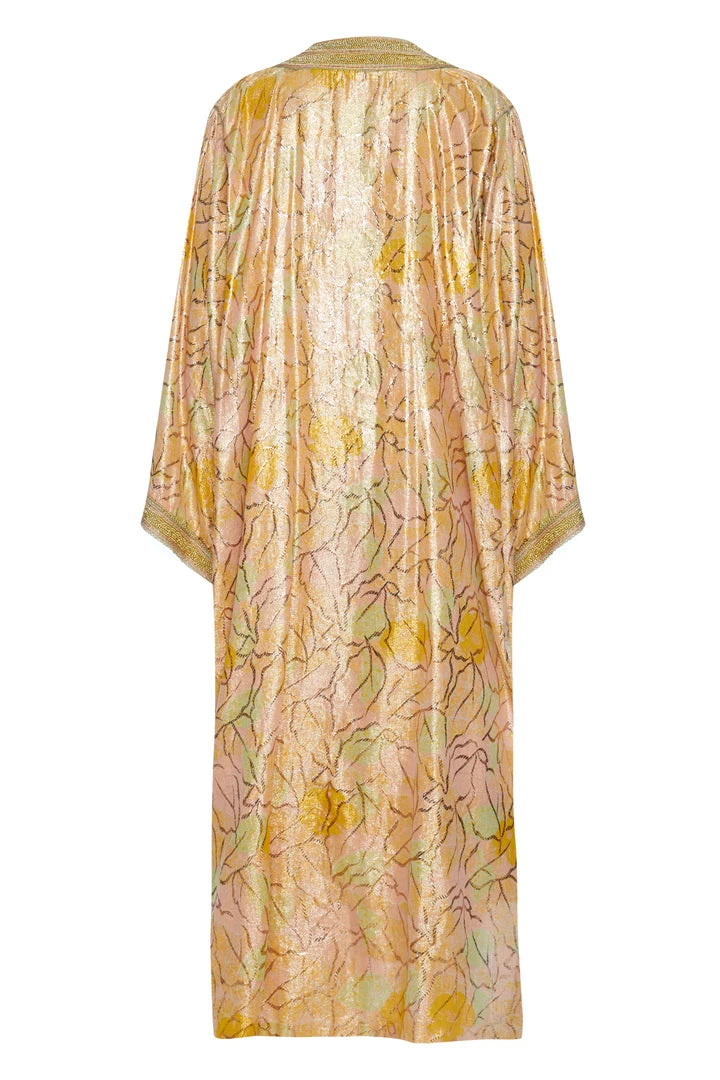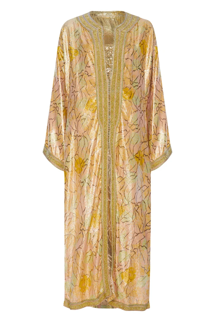 An authentic long v-neck kaftan handmade with real gold thread