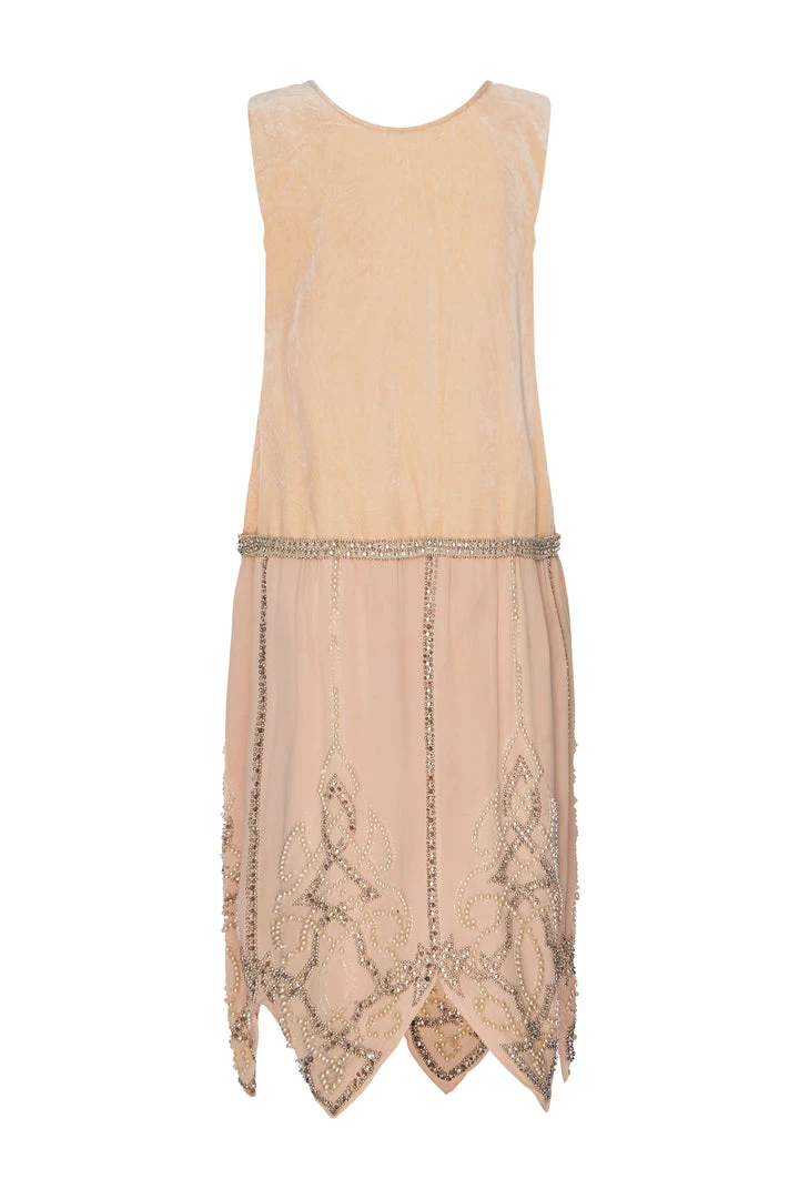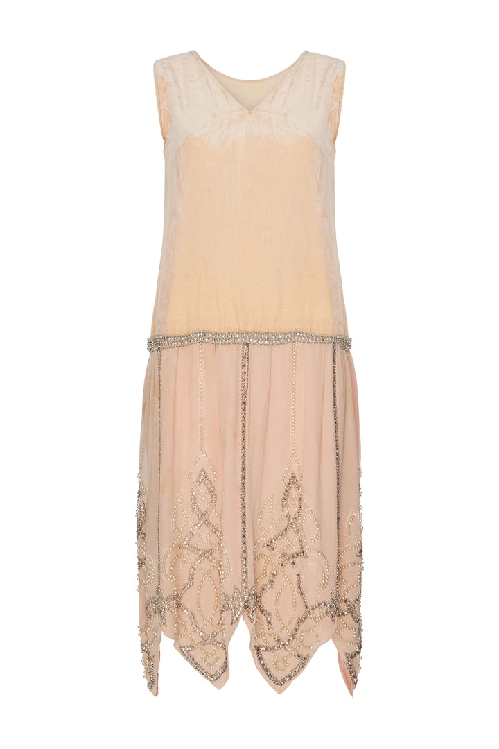A beautiful and original 1920s pale pink flapper dress finished with pearl beads and rhinestones; taffeta dress with net insertions and black