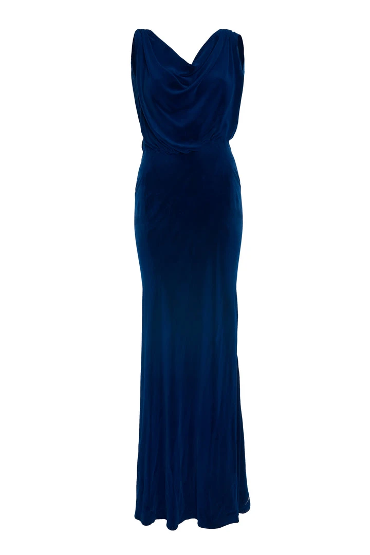 This one of kind 1930’s Deep Royal Blue velvet dress has a bias cut and hugs your hips while loosely draping down the legs.