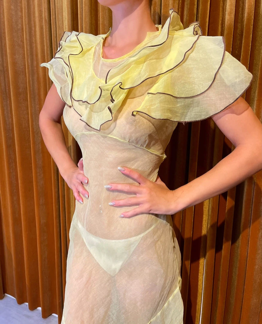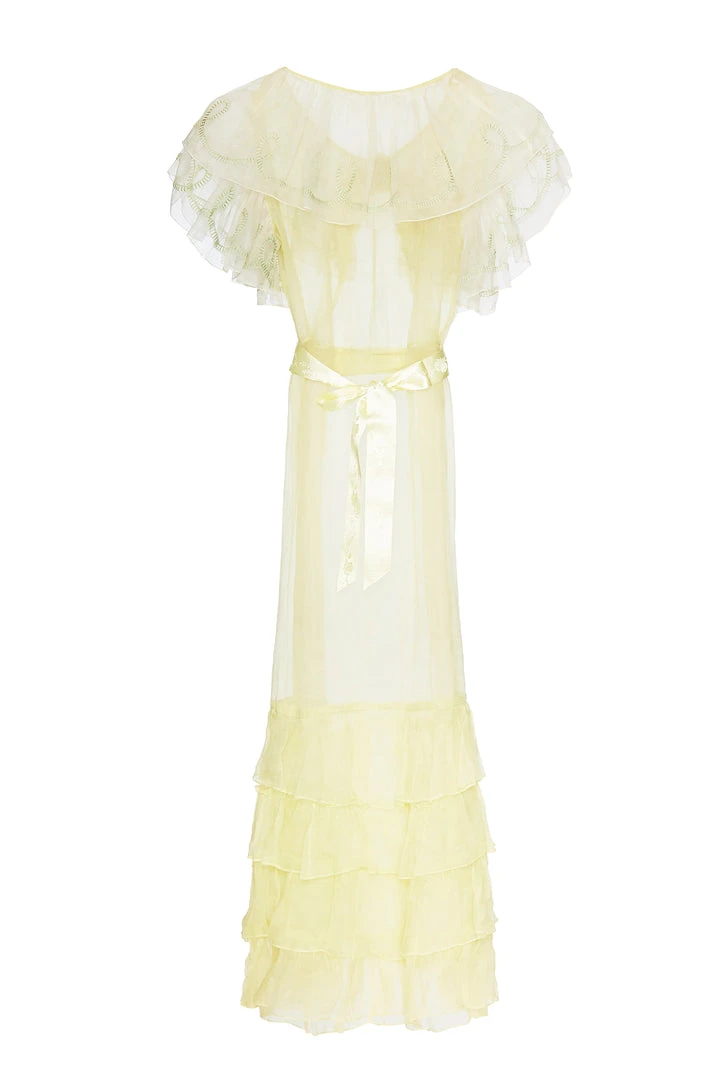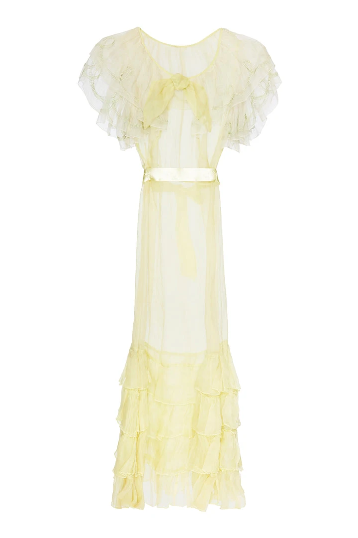 A stunning sheer organza made garden dress; layered ruff around neckline; zip fastening; floor length
