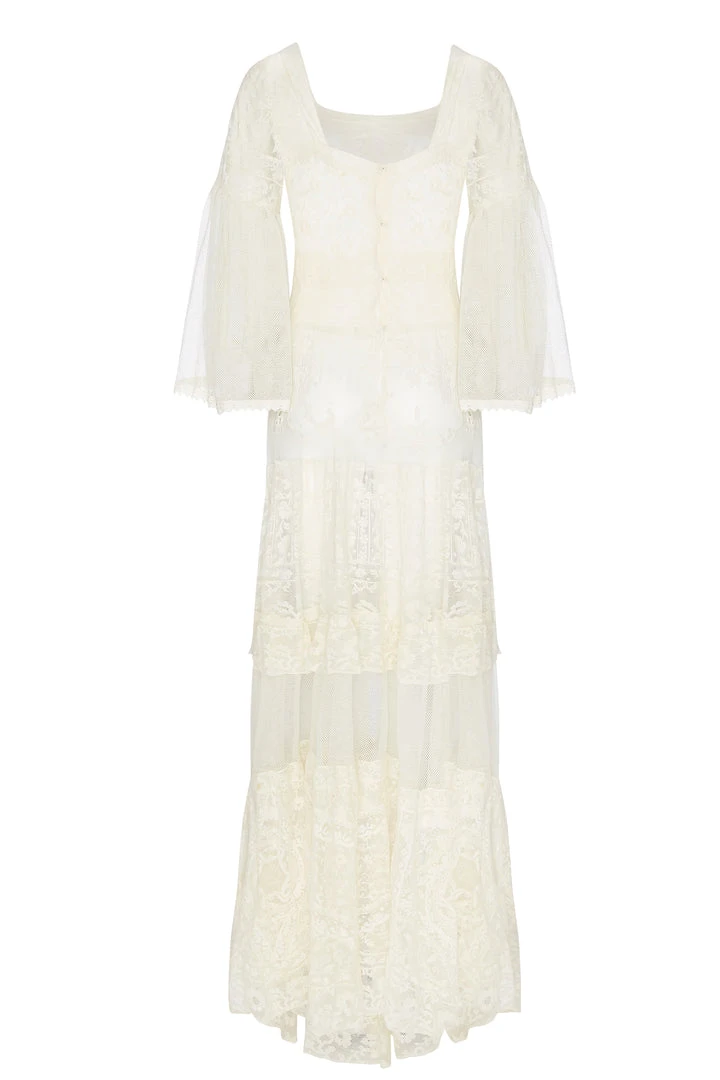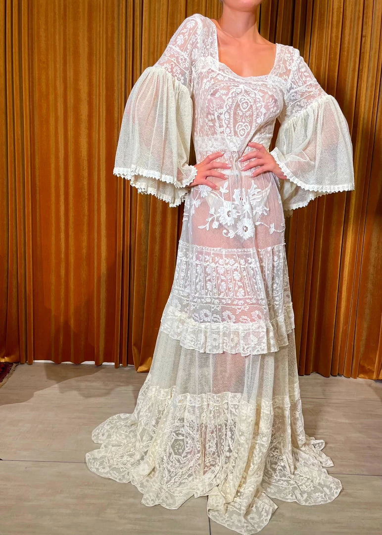 An ethereal 1930s sheer white lace dress; wide bell sleeves, floor length, floral embroideryÂ