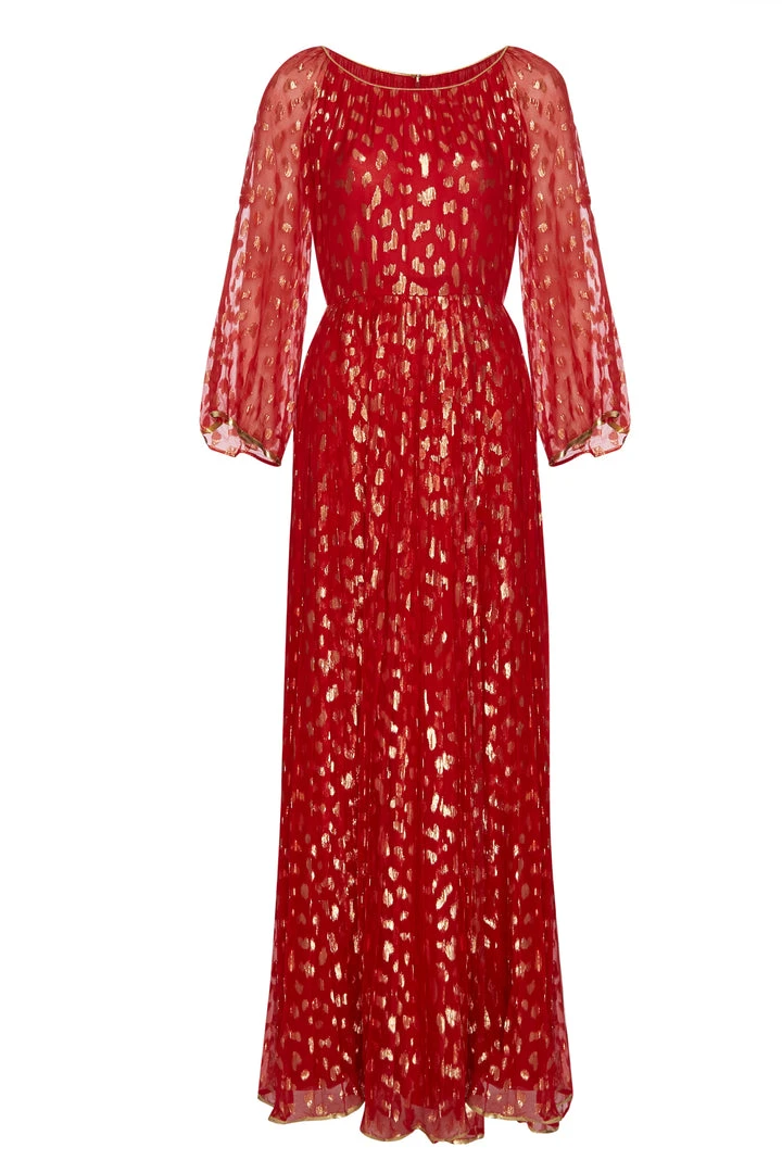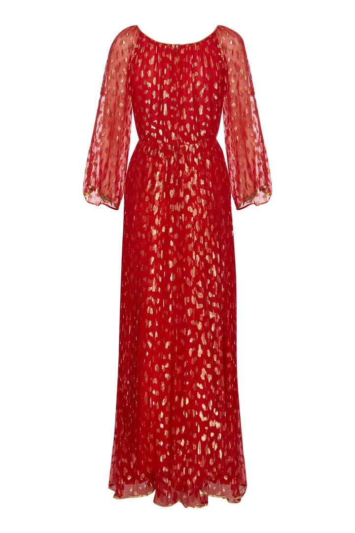 Annie’s Archive 1960’s Red Lame Pleated Red Gown With Gold Metallic Detailing. Rent: £55/Day