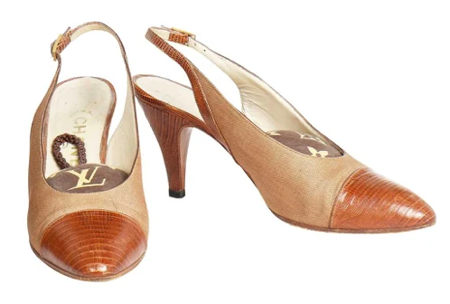 Rare 1980s Chanel signature two-tone fabric and faux lizard leather slingbacks; 1.5 inch heel; very good condition; signs of wear on sole