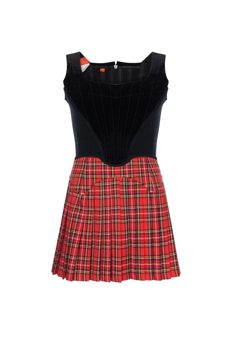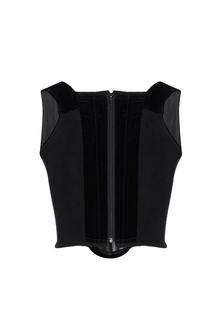 Late 1980s rare Red Label Vivienne Westwood Black Velvet Corset; labeled size 14, dipping into a ‘V’ at the front, the rear and side panels in black jersey