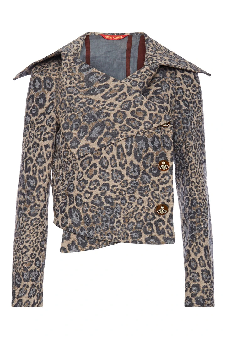 Red Label Vivienne Westwood Leopard-Spot Jacquard Jacket; fitted; oversized collar; three large signature Orb brown buttons; cropped