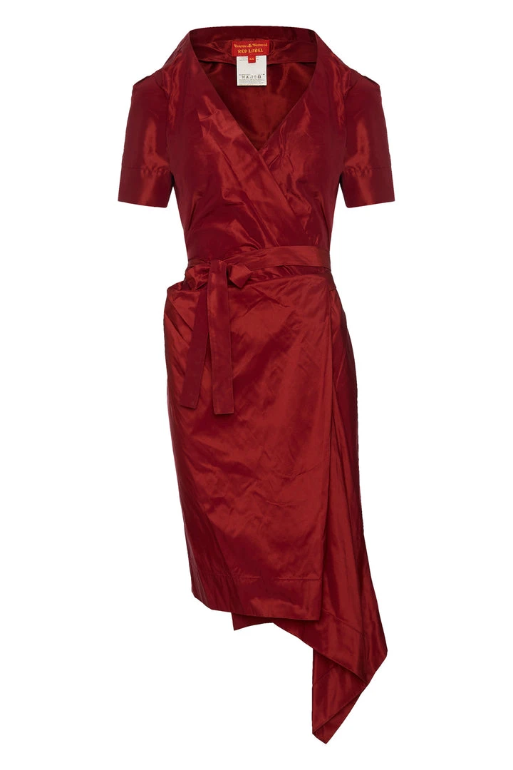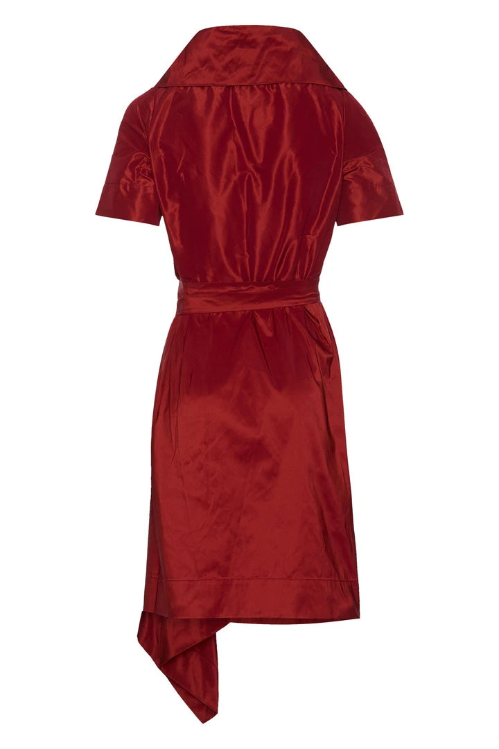 Ruched on lapels; knee length; wrap-around style; short sleeves; unlined
