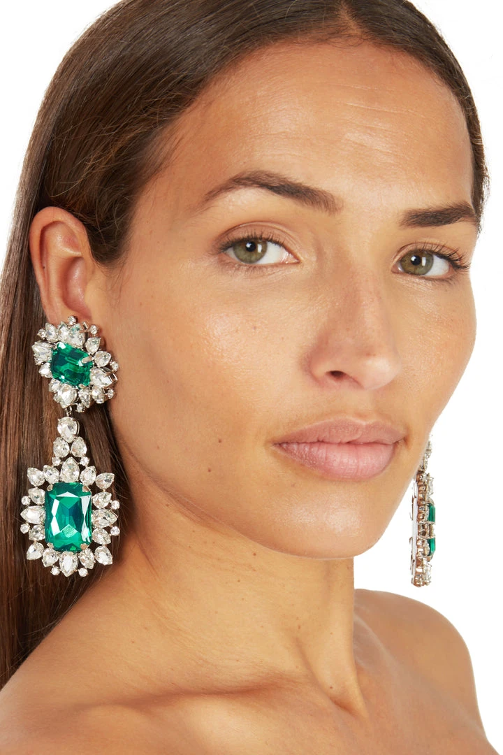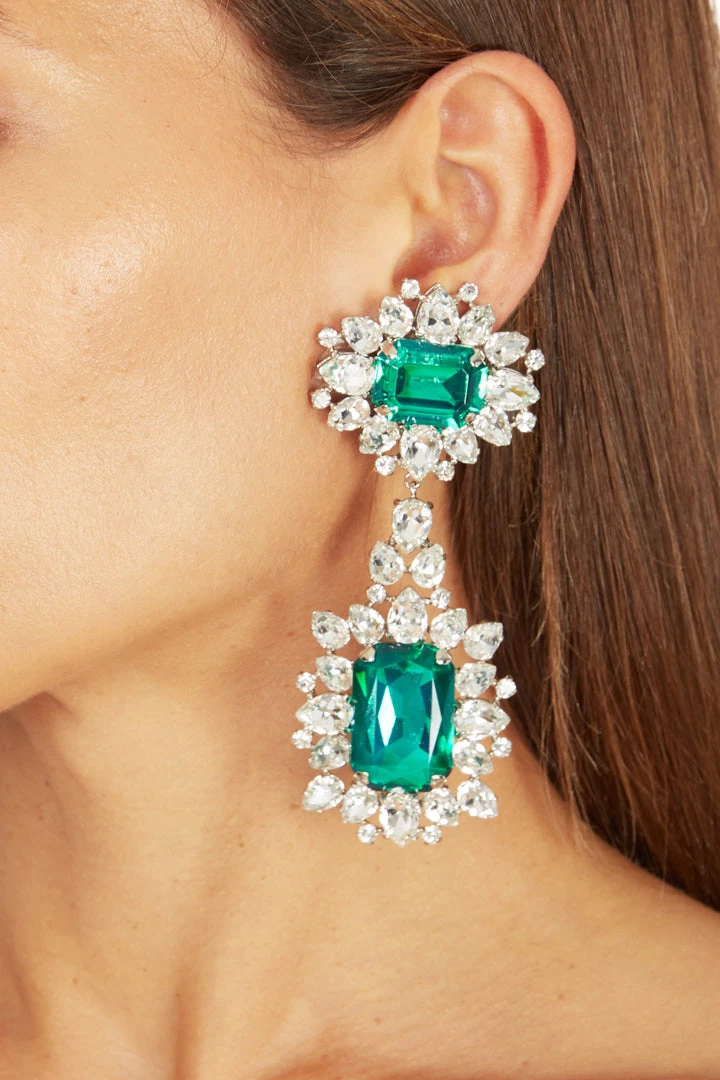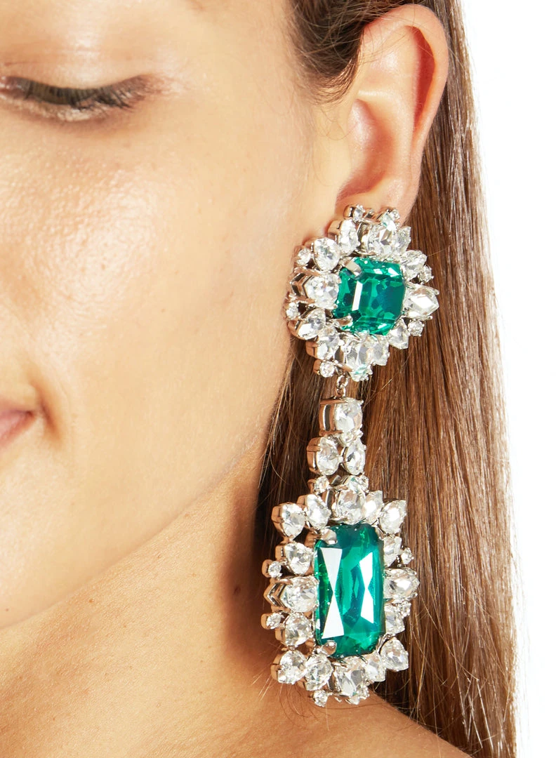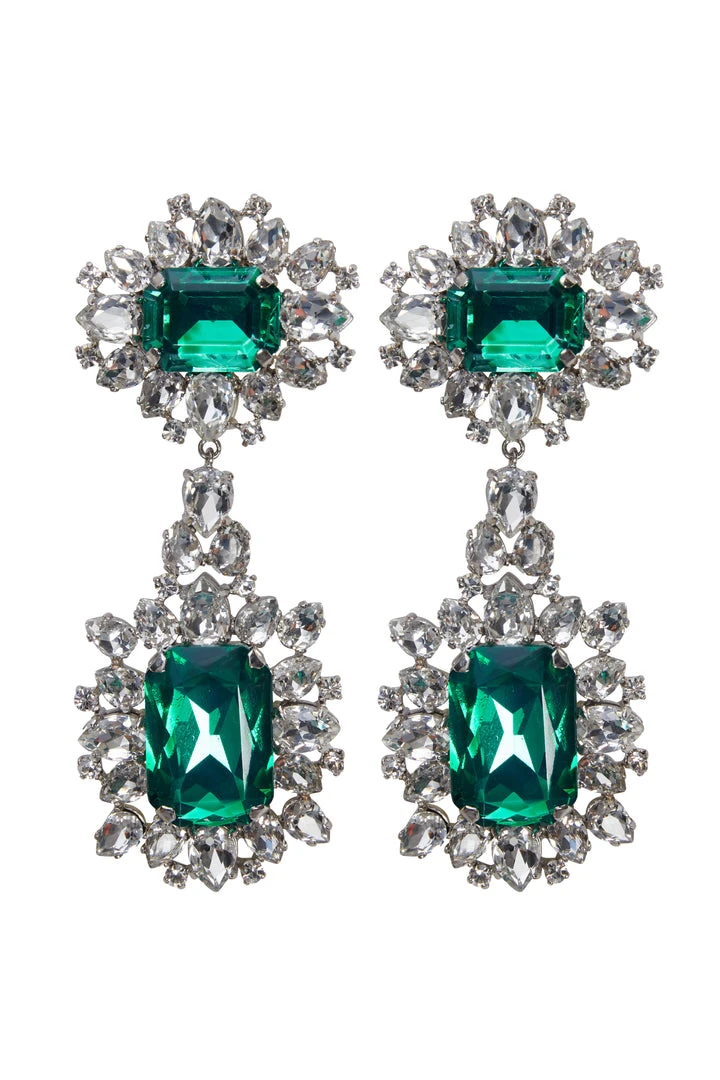 By Giambattista Vali These earrings are embellished with emerald stones set with glass stones.