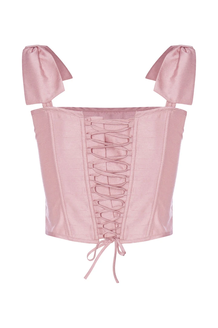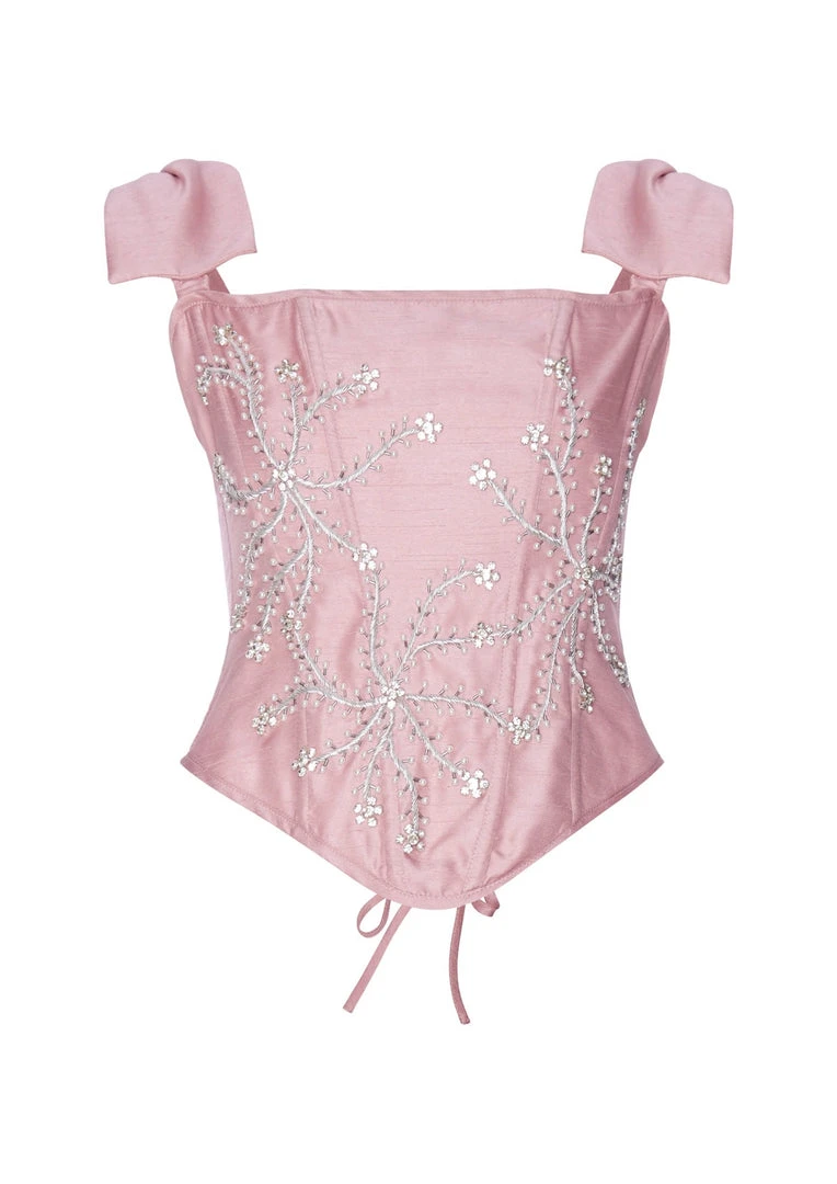 Live in your own enchanted fairytale with this hand-beaded corset.  The Ezra Pink Corset features beautiful beaded embroidery throughout the front with bow inspired straps.