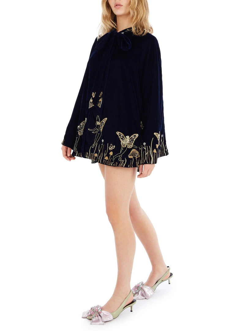 This velvet midnight blue cape is heavily embroidered with fairies perching on mushrooms under the moonlight.