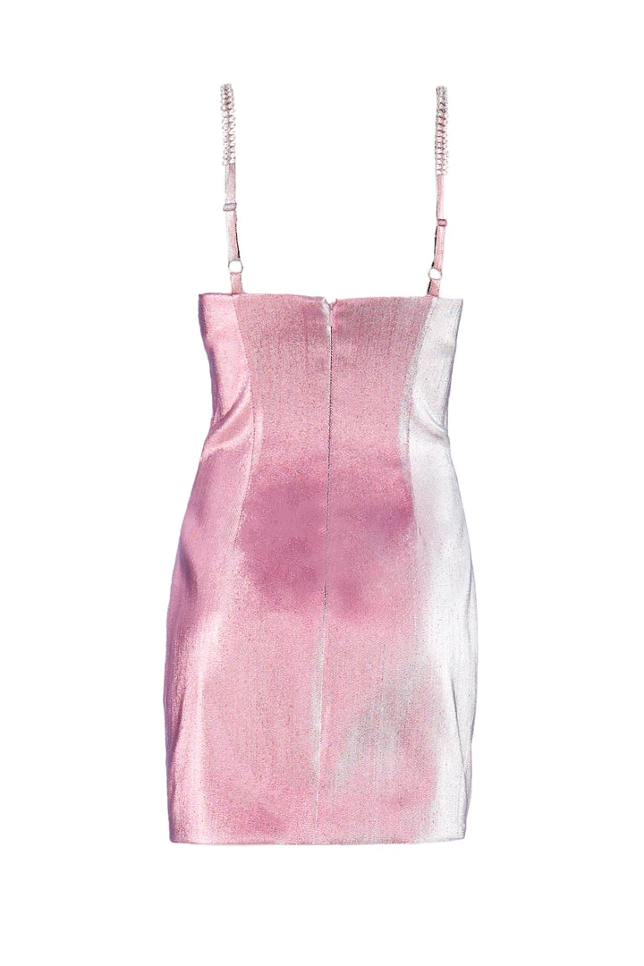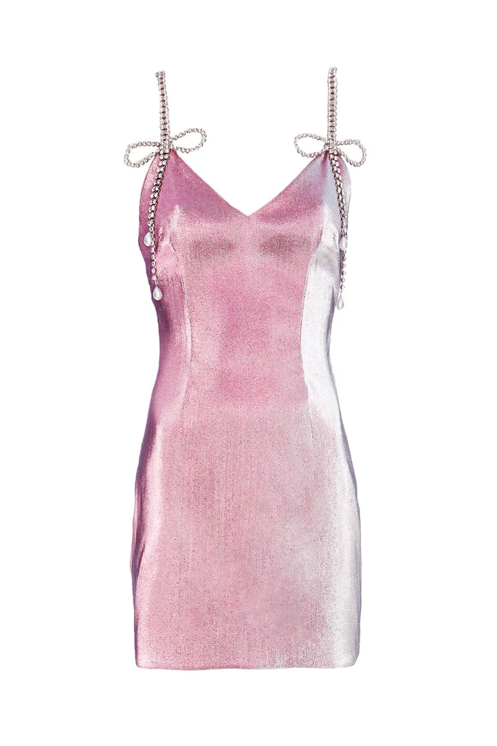 STRETCH LAMÉ MINI DRESS. FEATURES CRYSTAL BOW WITH PEARL DROP, ADJUSTABLE STRAPS, AND INVISIBLE ZIP CLOSURE AT CENTER BACK. AVAILABLE IN PINK.