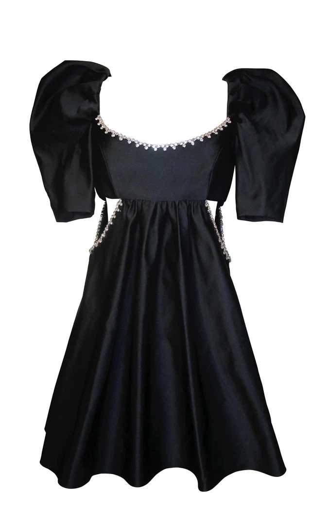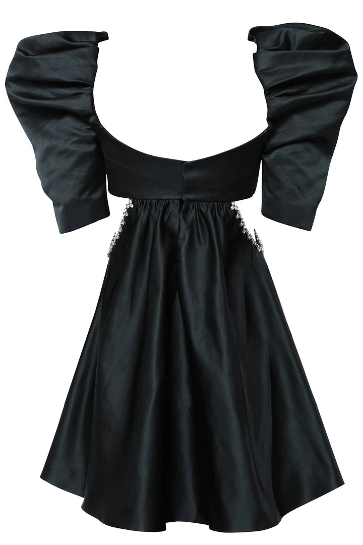 Area debuts innovative, unexpected silhouettes for FW ’20, shown in this satin mini dress. It’s designed with exaggerated sleeves and crystal-embellished trims. It nips in at the waist to flatter your figure and flares out at the a-line skirt. Team with sky-high platforms for your next party.