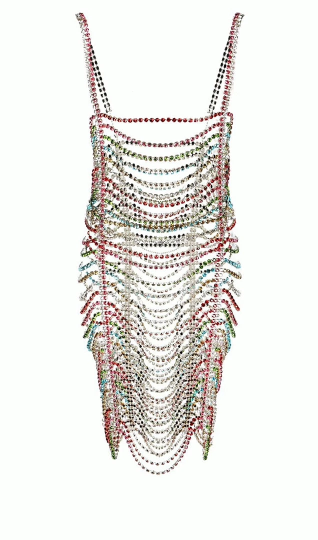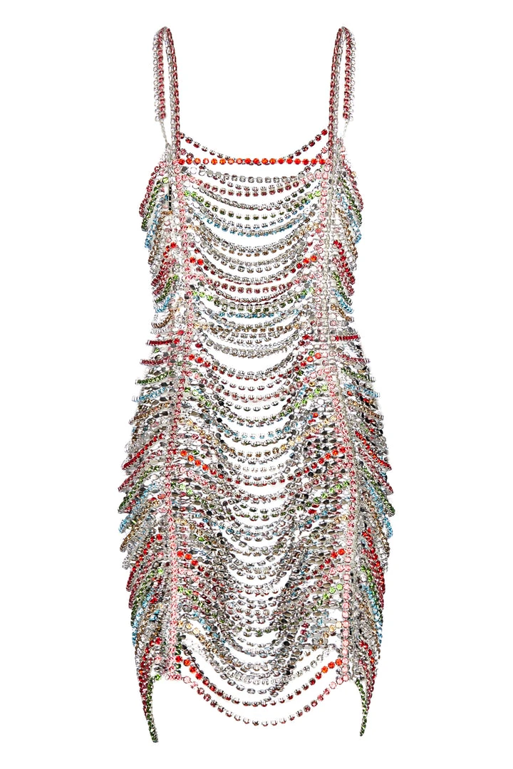 DRAPED CRYSTAL CUP-CHAIN MINI DRESS. FEATURES HOOK-AND-EYE CLOSURES ON EVERY CRYSTAL CUP-CHAIN ON THE RIGHT AT BACK. ADJUSTABLE CHAINS FOR A CINCHED WAIST AT FRONT AND BACK. ADJUSTABLE STRAP LENGTH. AVAILABLE IN MULTI/SILVER.