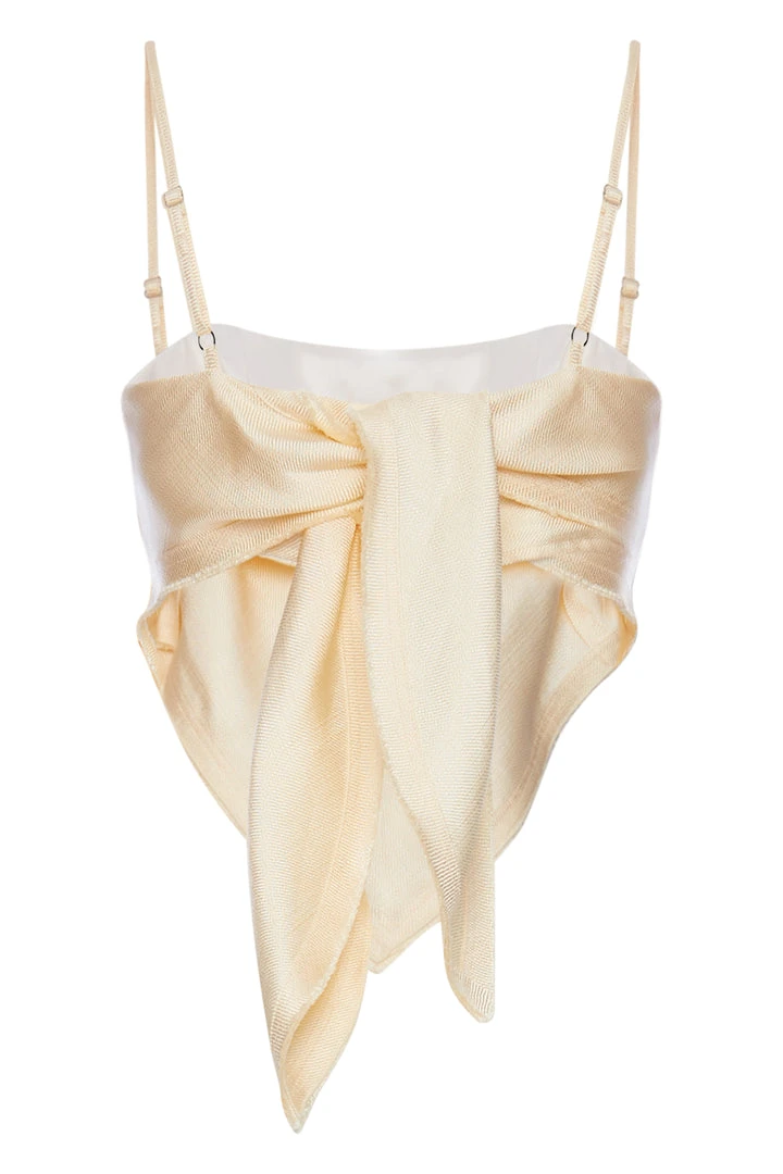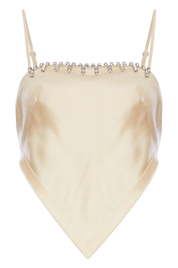 VISCOSE TWILLÂ HANDKERCHIEF BANDEAU TOP WITH SPAGHETTI STRAPS AND CRYSTAL TRIM AT NECKLINE. FEATURES HOOK AND EYE CLOSURES WITH TIES AT CENTER BACK.Â