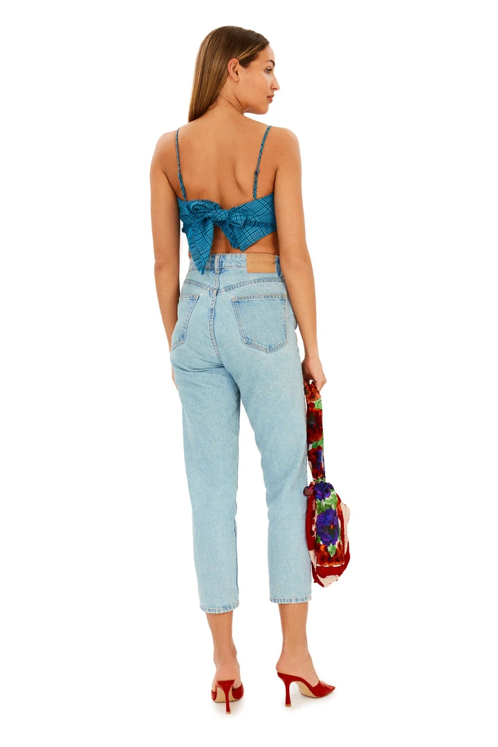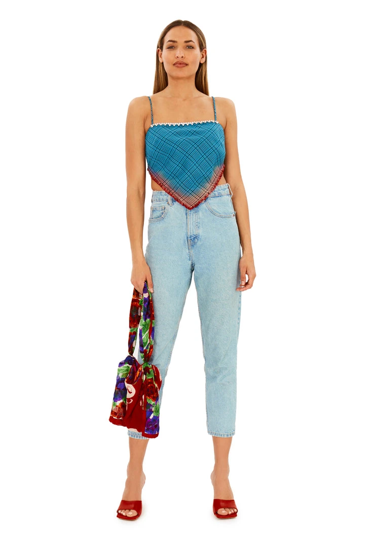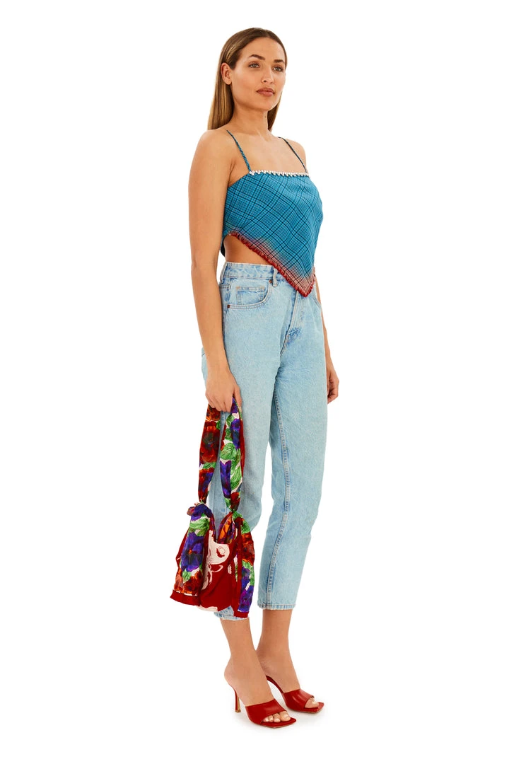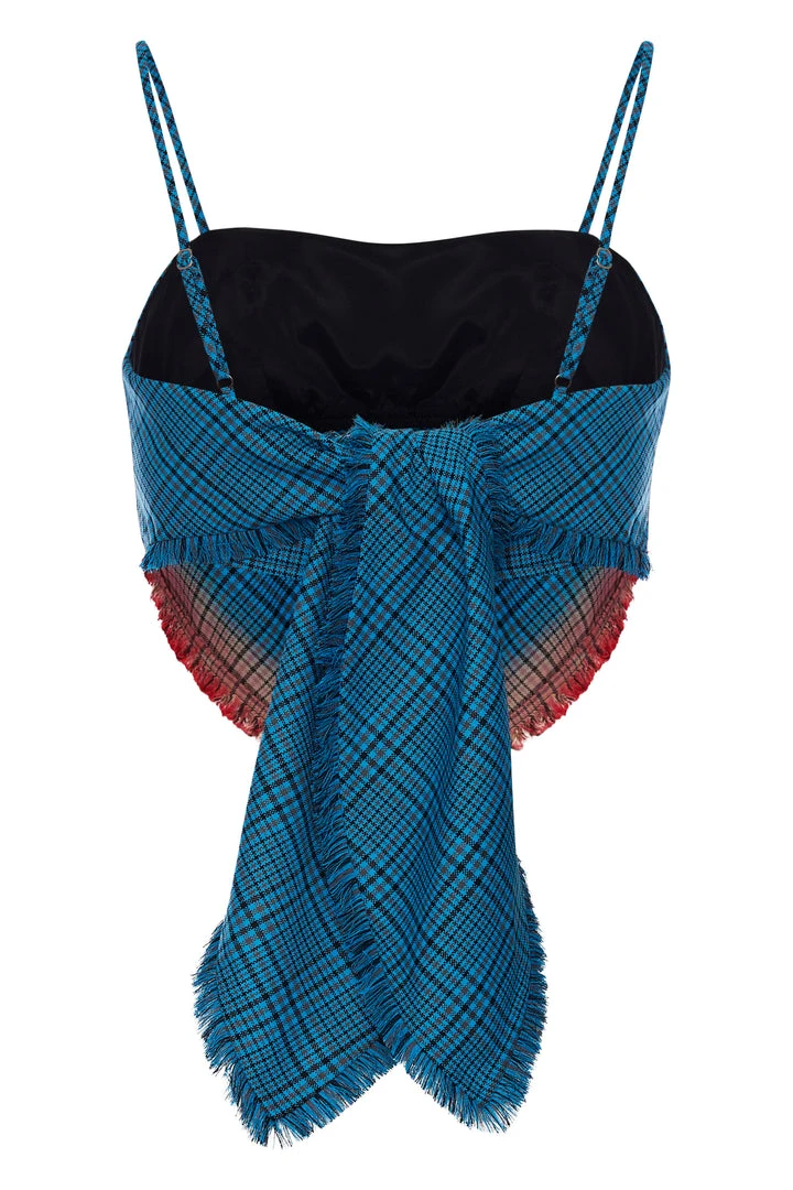 VISCOSE TWILLÂ HANDKERCHIEF BANDEAU TOP WITH SPAGHETTI STRAPS AND CRYSTAL TRIM AT NECKLINE. FEATURES HOOK AND EYE CLOSURES WITH TIES AT CENTER BACK.Â