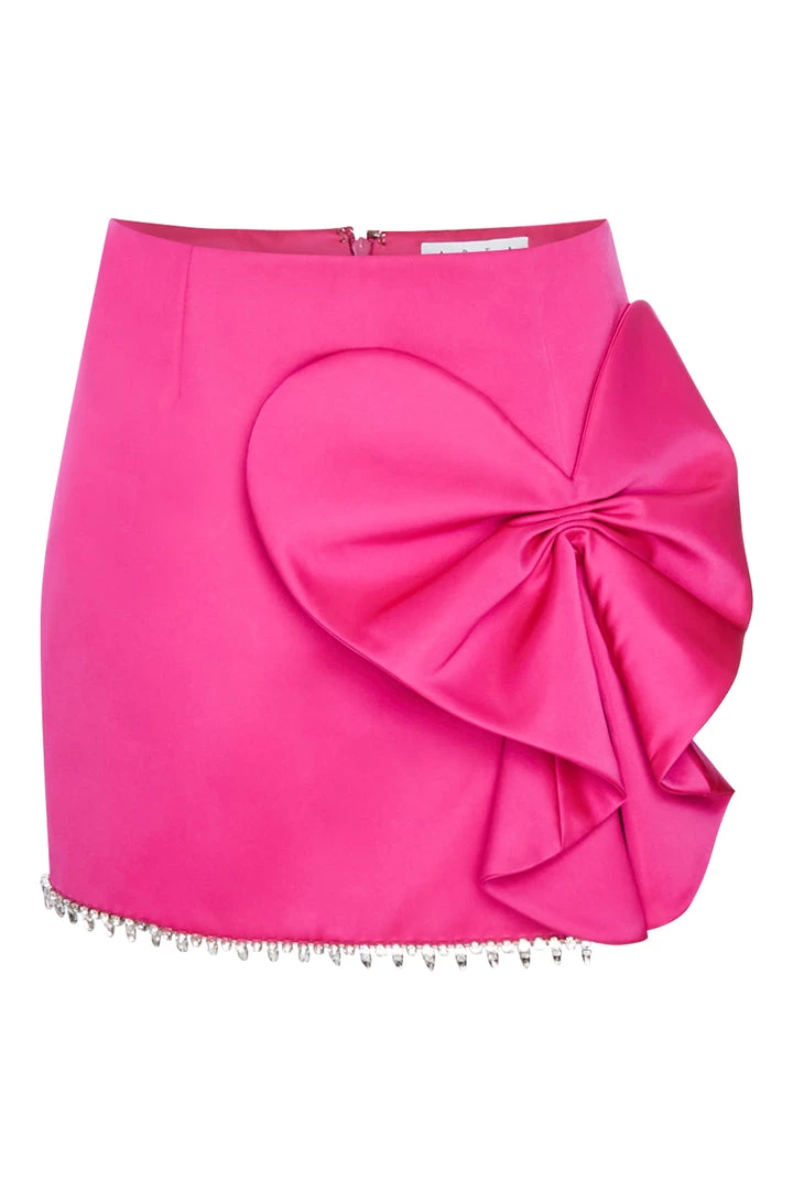 DUCHESS SATIN HEART BOW MINI SKIRT WITH CRYSTAL TRIM AND SLIT AT HEM. FEATURES INVISIBLE ZIP CLOSURE AT CENTER BACK. AVAILABLE IN PINK.