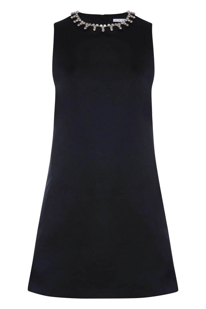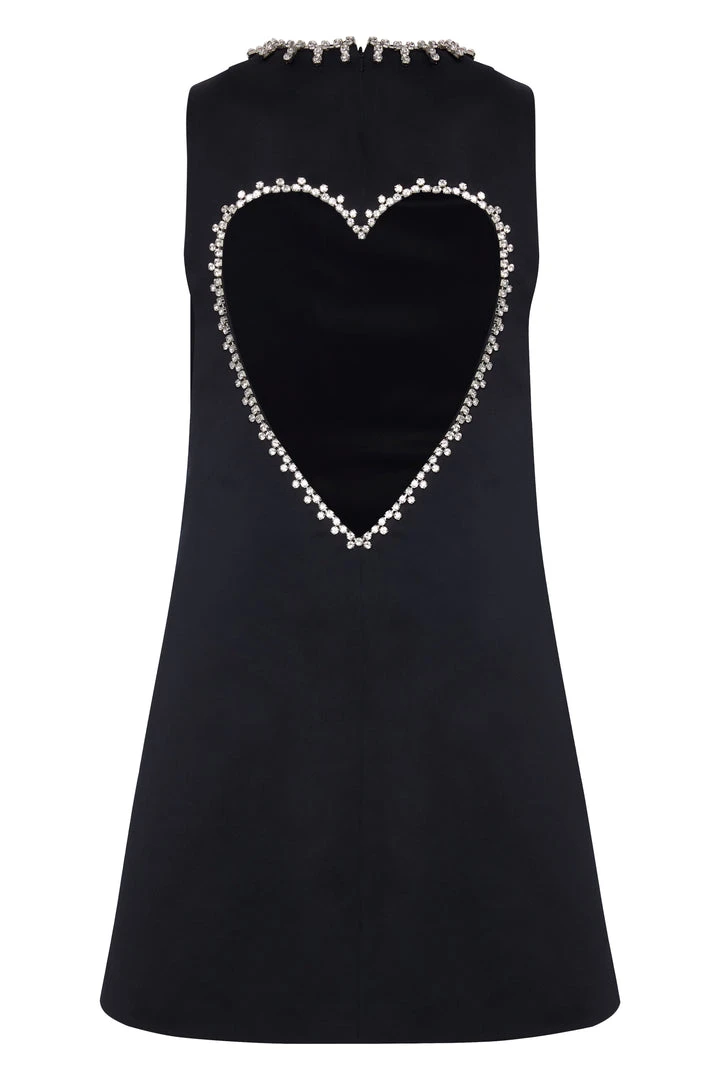 A-LINE MINI DRESS WITHÂ CRYSTAL-TRIMMED HEART CUTOUT BACK DETAIL. FEATURES POCKETS AT SIDE SEAMS & HOOKÂ & BAR CLOSURE AT BACK. AVAILABLE IN BLACK.