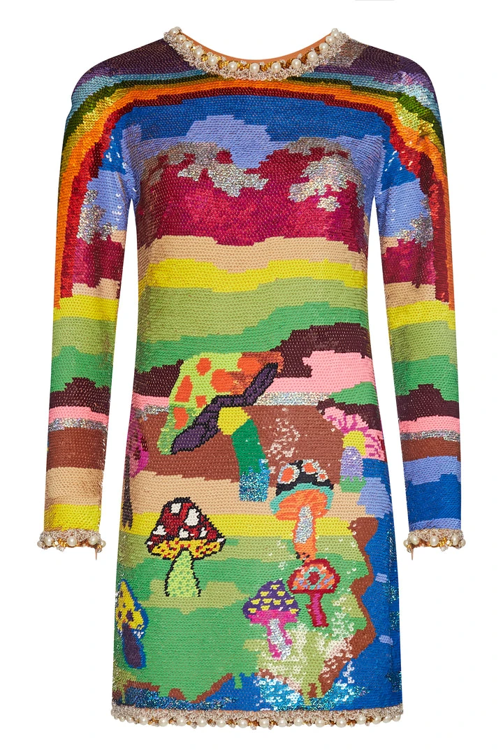 The vibrant look of Ashish’s multicoloured Rainbow Mushroom dress is inspired by kitsch ‘touch tapestries’ – an old-school at-home crafting technique of making tapestry pictures without stitching. It’s made from viscose georgette that’s embellished with sequins depicting a psychedelic landscape, then edged by crystals and faux pearls for a high-octane finish.
