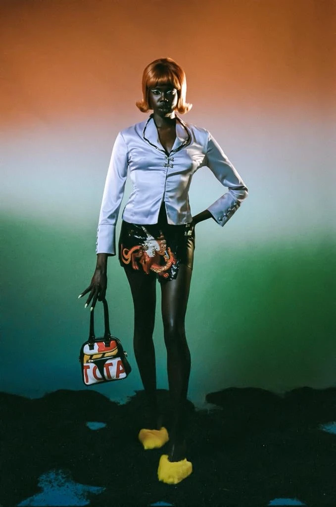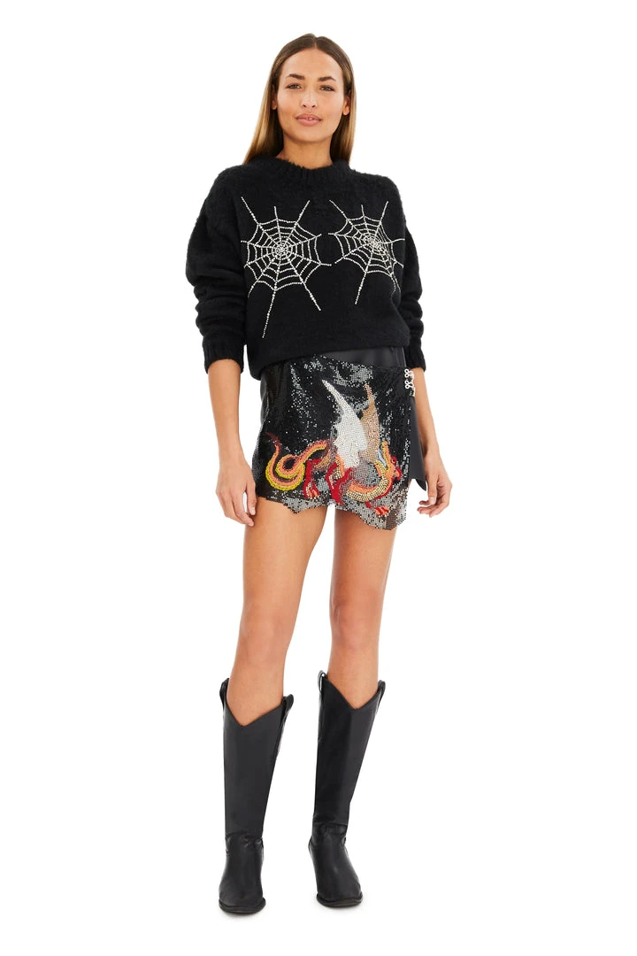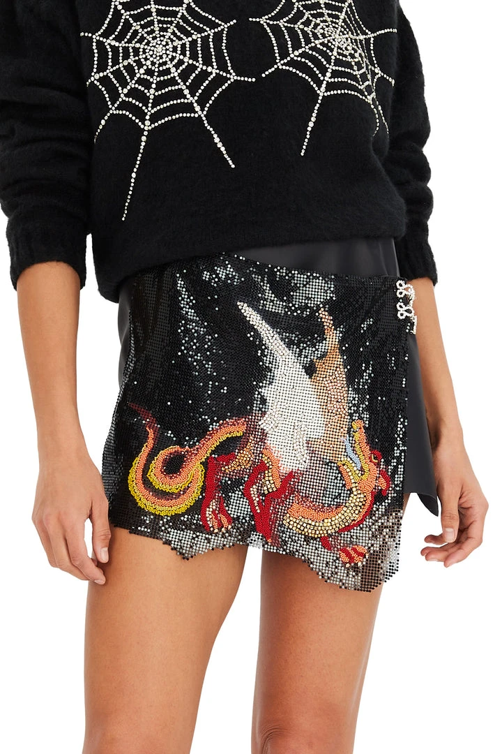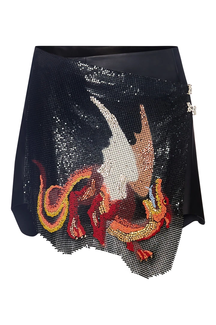 Made from faux leather with a front panel of shimmering black chainmail featuring a print, bead and crystal embellished dragon inspired by disintegrating medieval tapestries. Asymmetric shape mini with a ‘ripped’ effect hem. Fastens with invisible poppers and two crystal frog clasps.