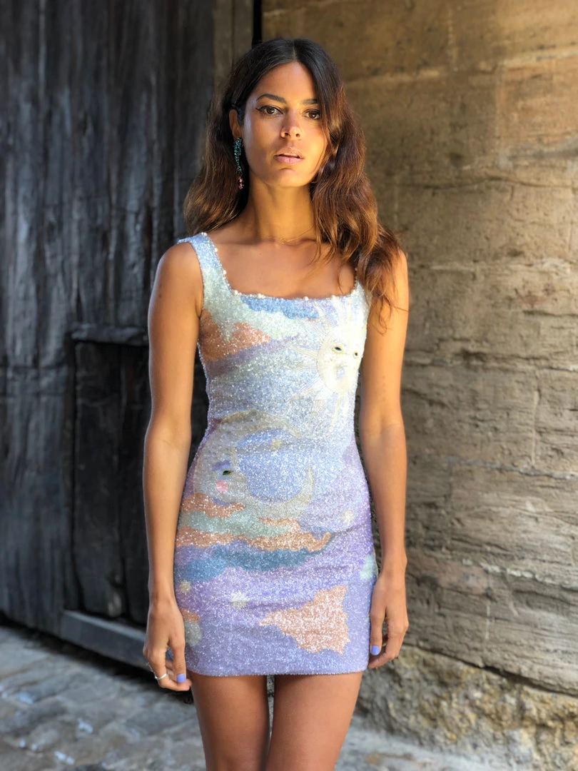 Our classic Lucina dress reimagined in powder blues and dusky lilacs with a glittering Swarovski neckline trim. Delicately hand beaded for a sparkling finish. The silhouette features a fitted body with some stretch, thicker straps and a smooth, squared neckline.