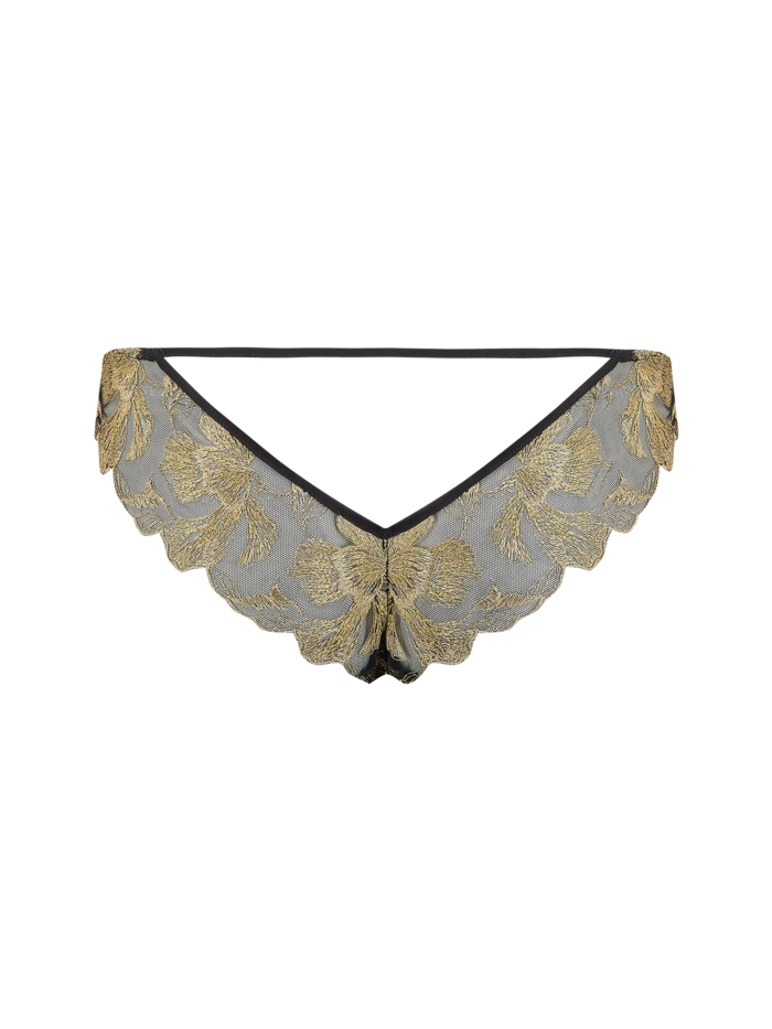This entirely flattering Coco de Mer staple is brought to new mystical heights with regal gold embroidery and tantalisingly sheer coverage.