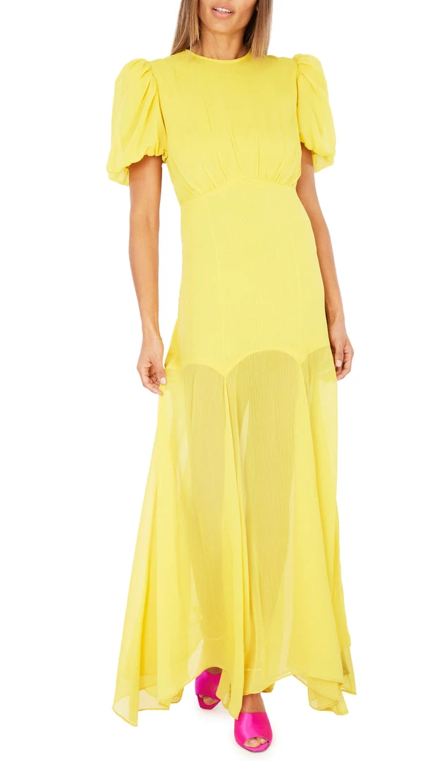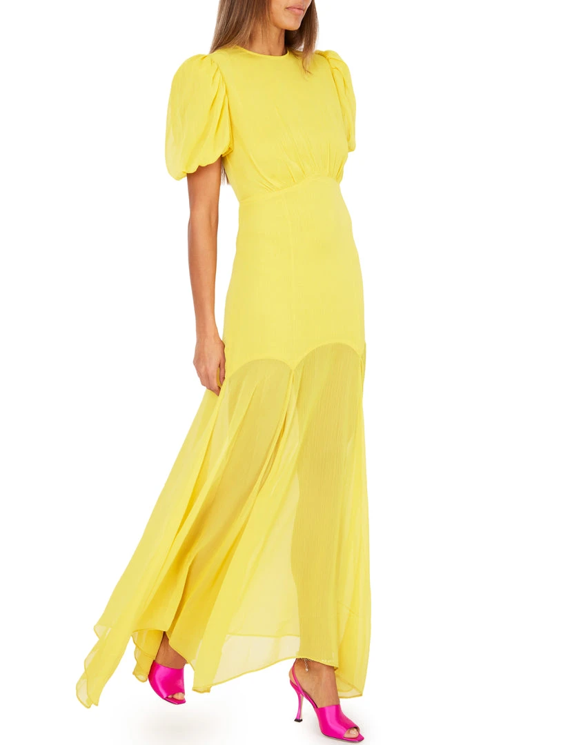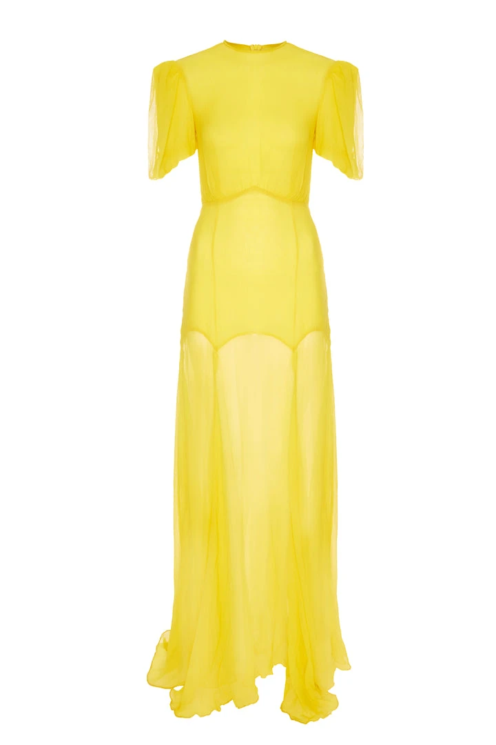 A true De La Vali showstopper, this season welcomes the launch of The Agua. A gown fit for any summer party or event, so stunningly designed it could easily be mistaken for a vintage treasure. Constructed in chic, sheer golden yellow chiffon with gentle seam detailing to flatter the figure and fall to a perfect silhouette.Â