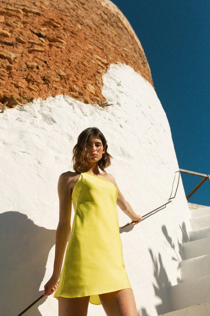 She’s back for SS21, this best selling powerful mini dress from De La Vali. The Lithium is everything and more for the approaching summer months this time in a flirty, vibrant yellow shade. Inspired by the brand’s Ibizan heritage, this luxury mini dress is the ultimate dress to take from day to night. The asymmetric spaghetti strap and neckline give it an ultra feminine touch, ensuring you’re all set for any party occasion.