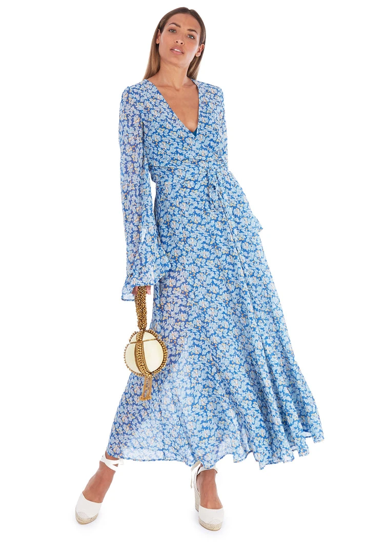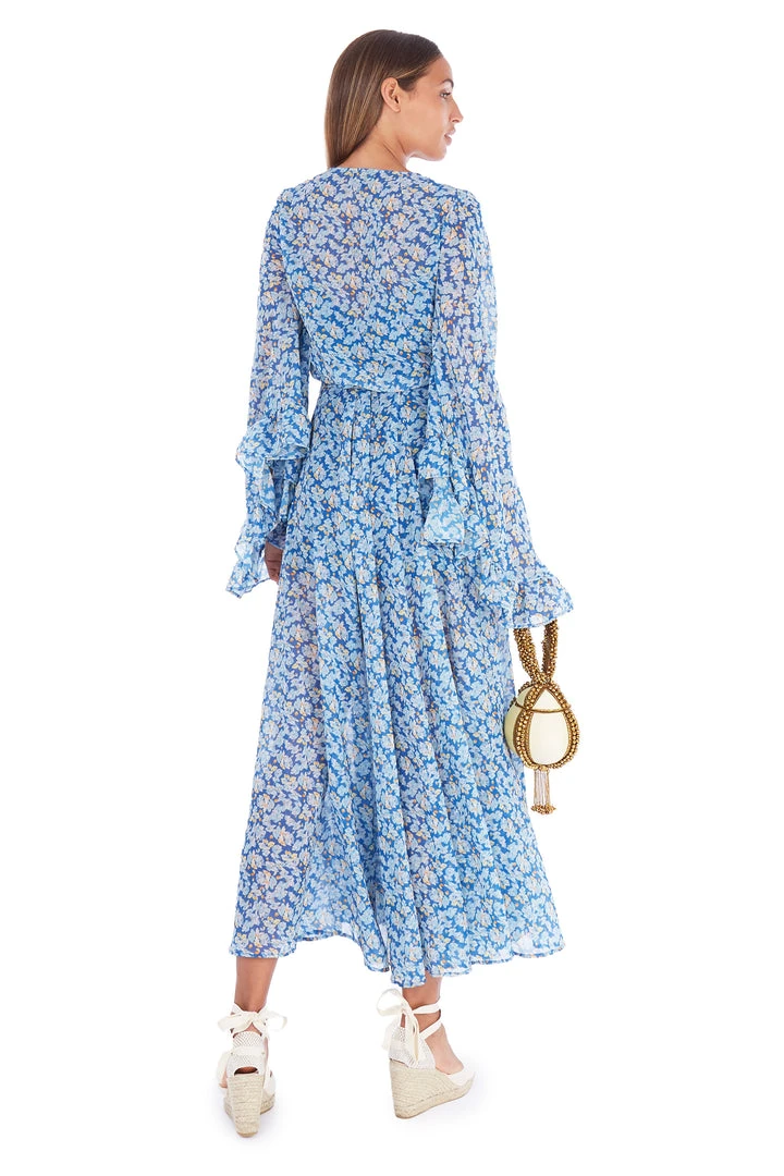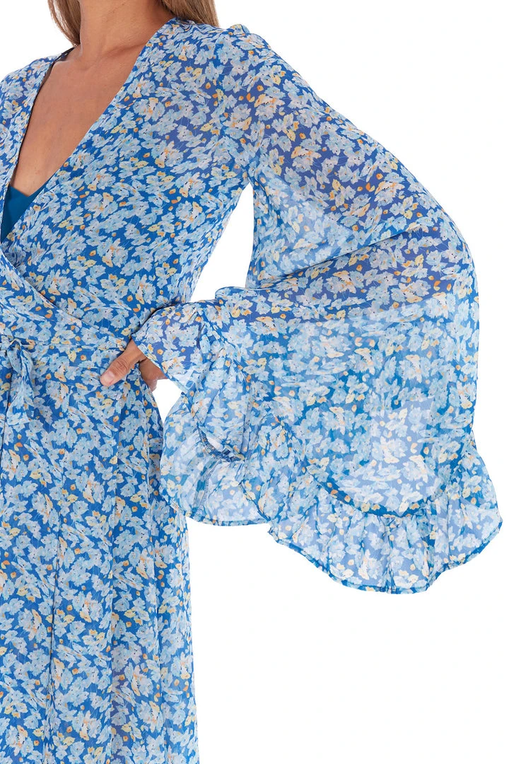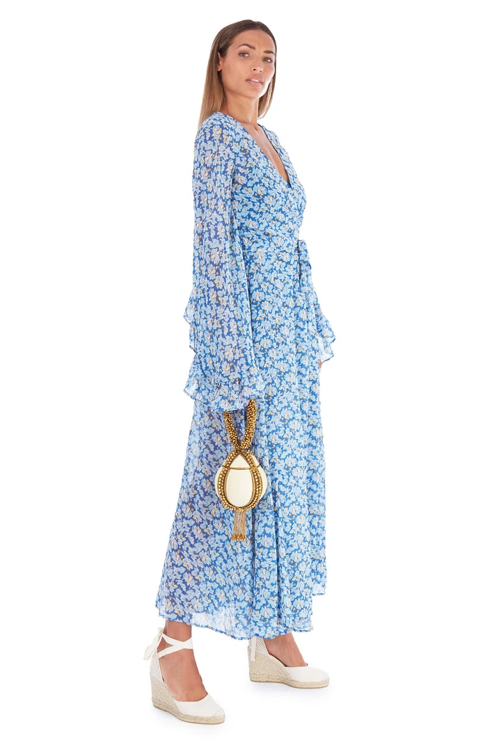 Floaty and free for the Vali Vixen with a bohemian soul, this semi sheer wrap around dress has an ethereal quality that is shrouded in mystery. The plunging neckline gives way to a waistline cinched in by a wrap-around tie. Exaggerated sleeves flare out with a subtly mitred point and the maxi-length hemline is delicately draped.