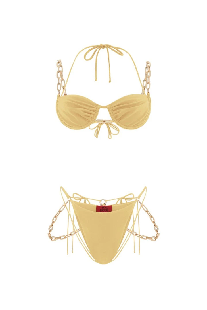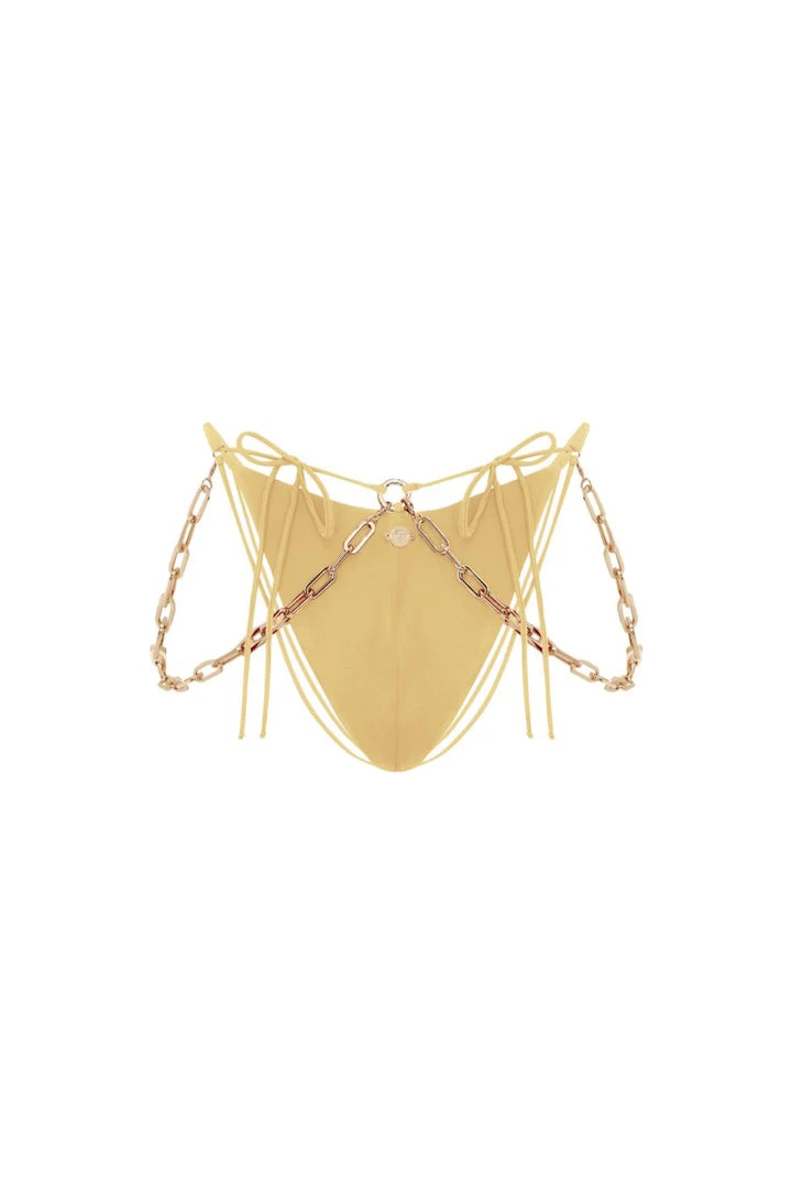 The Belly Dancer Bikini Bottom is made from smooth swimwear fabric. The high-rise briefs have slim straps on the sides as well as detachable straps that goes around the bottom and ties at the back. It’s finished with gold chain side straps that are detachable. It comes in black, red, pink, yellow and peach