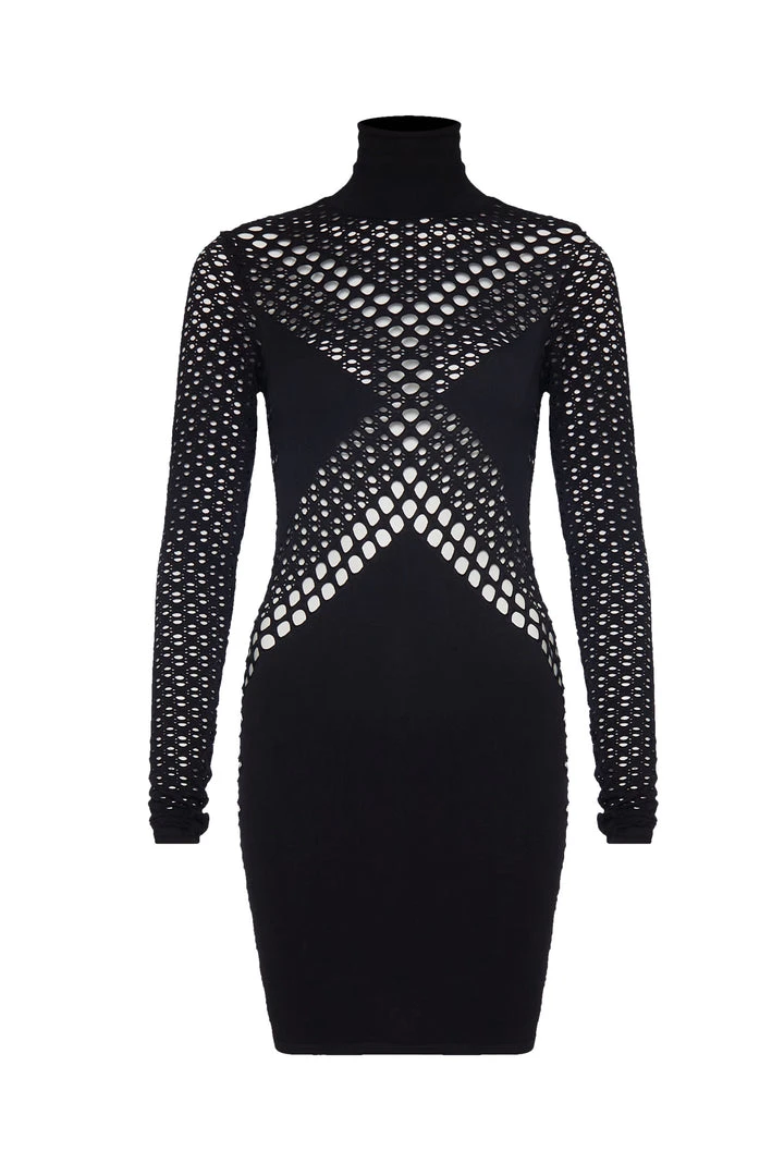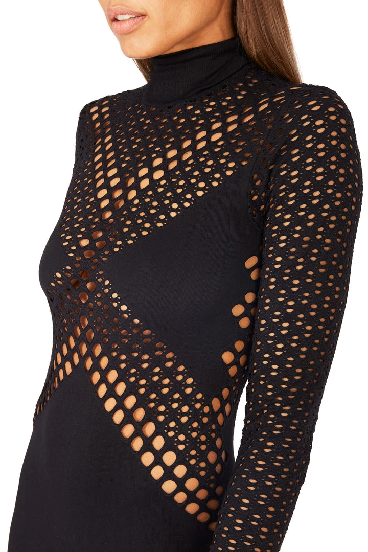 Long sleeve full length dress constructed in a highly technical seamless knit. Featuring patterns of cut outs throughout and opaque panelling. High neckline. Cut for a skin tight fit.