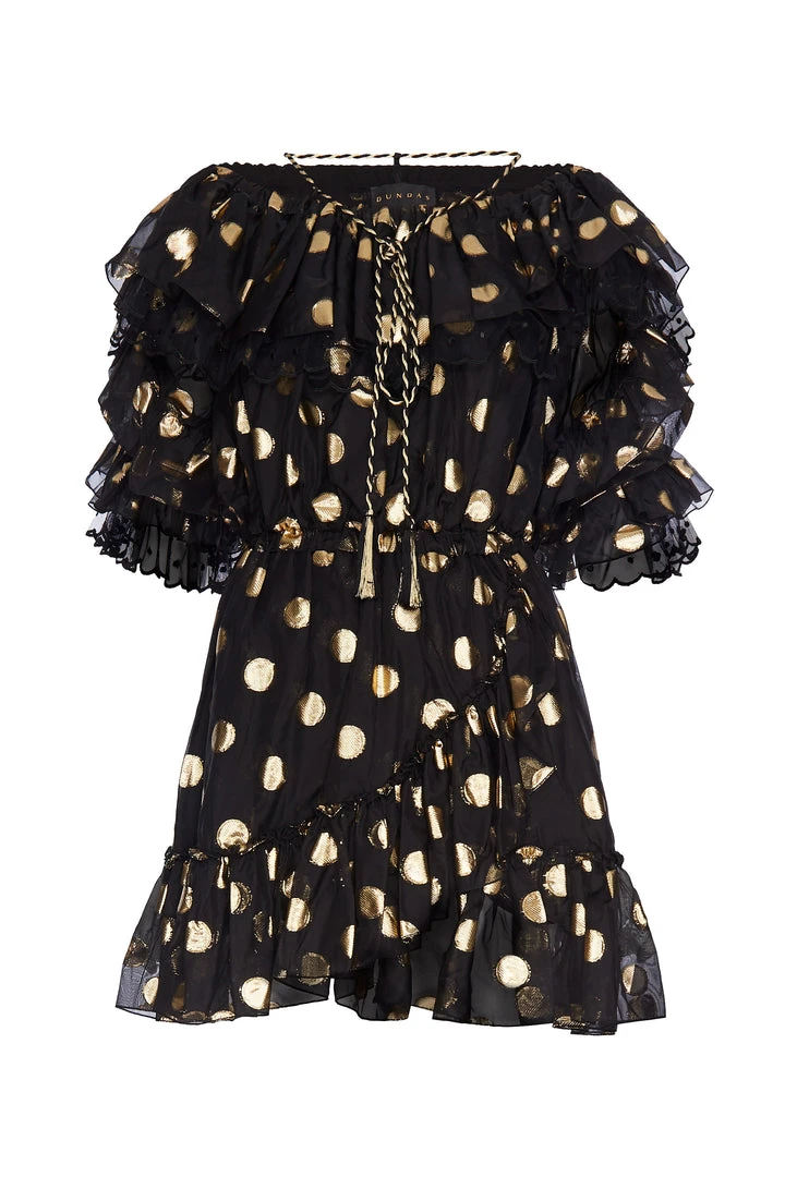 Adjustable straps with self-tie closure. Elastic waistband, ruffled details