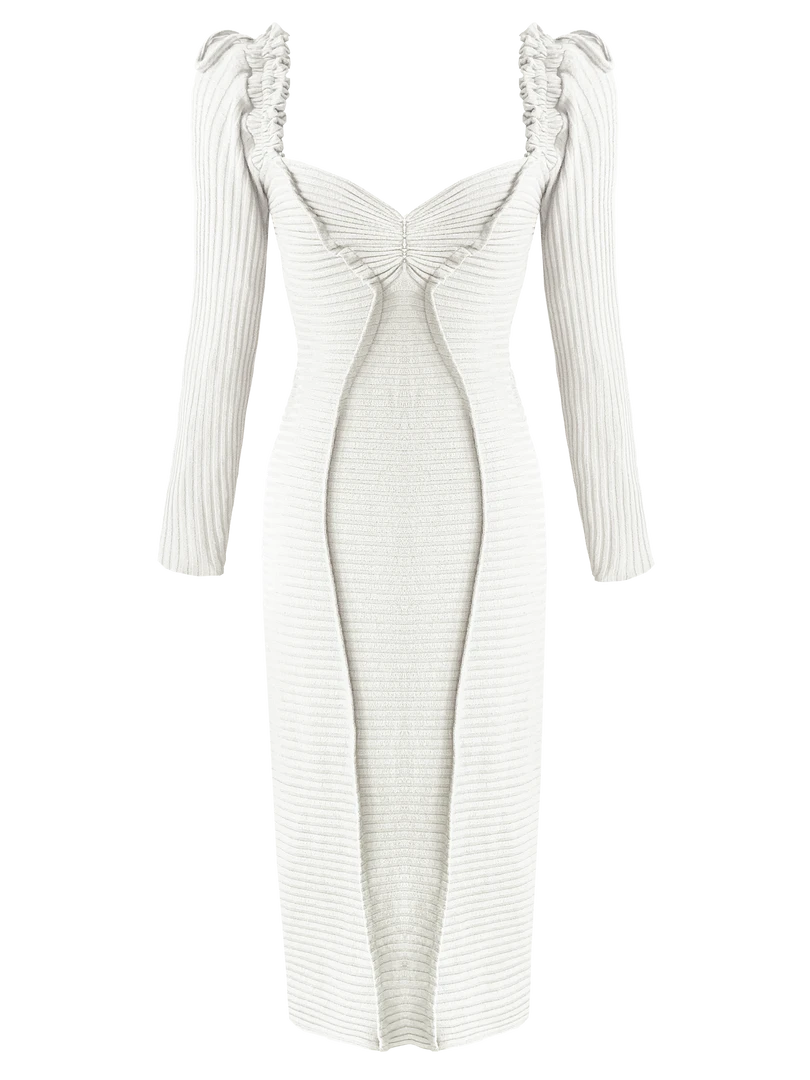 Midi Dress crafted from a soft viscose, ribbed jersey. Unique tuck detailing down the front, deigned to flatter the figure and featuring gathers to fit and form around the body. A follow on from the bestselling Mila Dress, but with an adjustable puff sleeve.Â