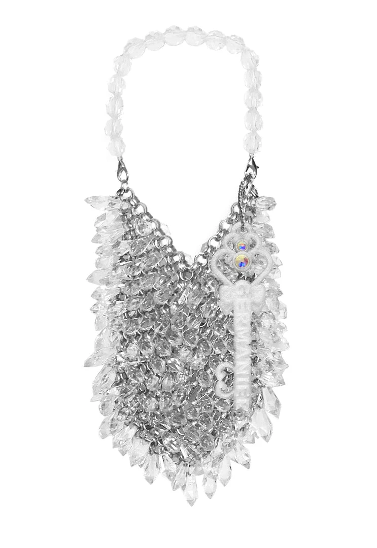 This mini crystal bag is crafted from clear upcycled and discarded beads held together with silver eyelet rings. Style it via the detachable long chain strap or the short strap for a more directional look. It dimensions are about 13cm long and 12cm wide. It can fit an Iphone 12, a lipstick or any party essentials.
