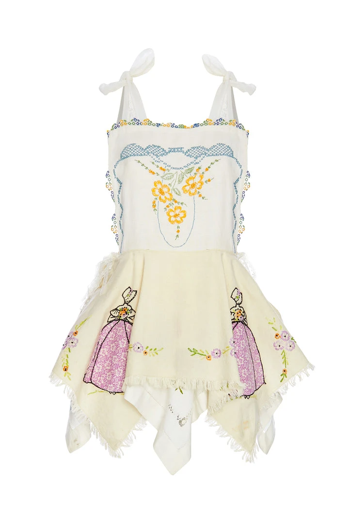 This garment is crafted from antique table cloths circa 1950’s-1970’s. Antique dresser scarves circa 1970’s. Beautifully handmade with vintage trimmings.