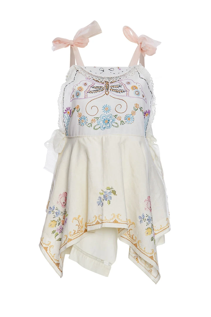 This garment is crafted from antique table cloths circa 1950’s-1970’s. Antique dresser scarves circa 1970’s. Beautifully handmade with vintage trimmings.