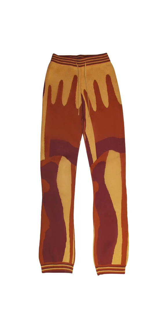 Knit trousers in 100% cotton. Jacquard knitted abstract pattern in tone on tone colors. With a tie elastic waist, a fitted silhouette, and slightly flared bottom leg, the knit trousers are suitable for a relaxed as well as a festive setting. The style is true to size & the model wears a size S/M.