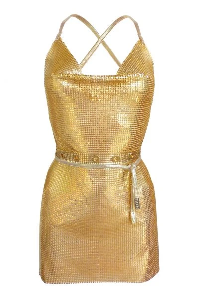 Stunning backless metal dress with adjustable straps & belt included.