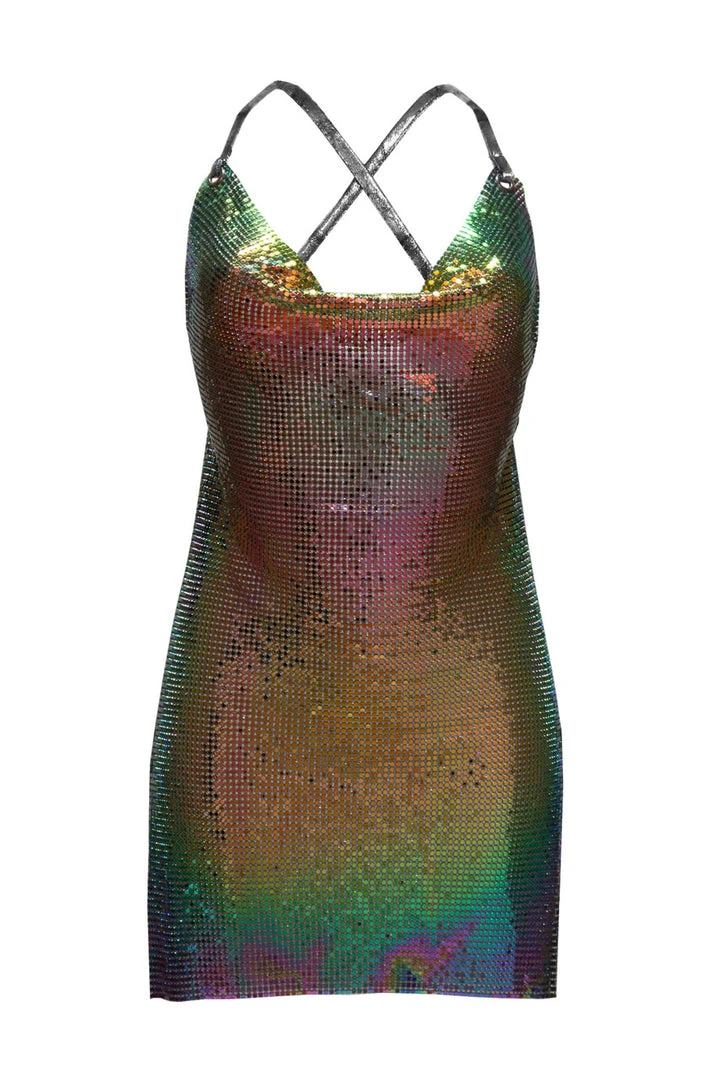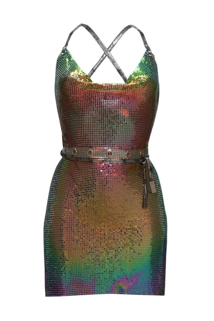 Stunning backless metal dress with adjustable straps & belt included.