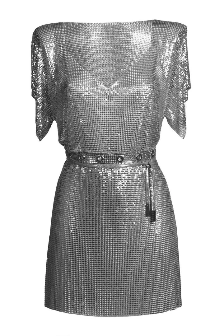 Iconic T-shirt style metal dress handwoven from metal mesh fabric in our Ibiza workshop, belt included.