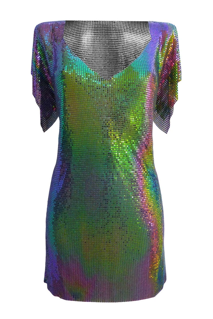 Iconic T-shirt style metal dress handwoven from metal mesh fabric in our Ibiza workshop, belt included.