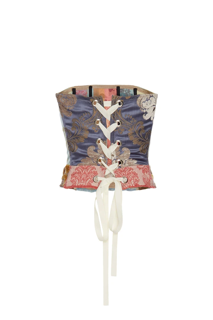 A unique corset hand-made by Kristin Mallison; made from reused laces. Inserts of vintage lace pierced together to create a one-of-kind statement piece.