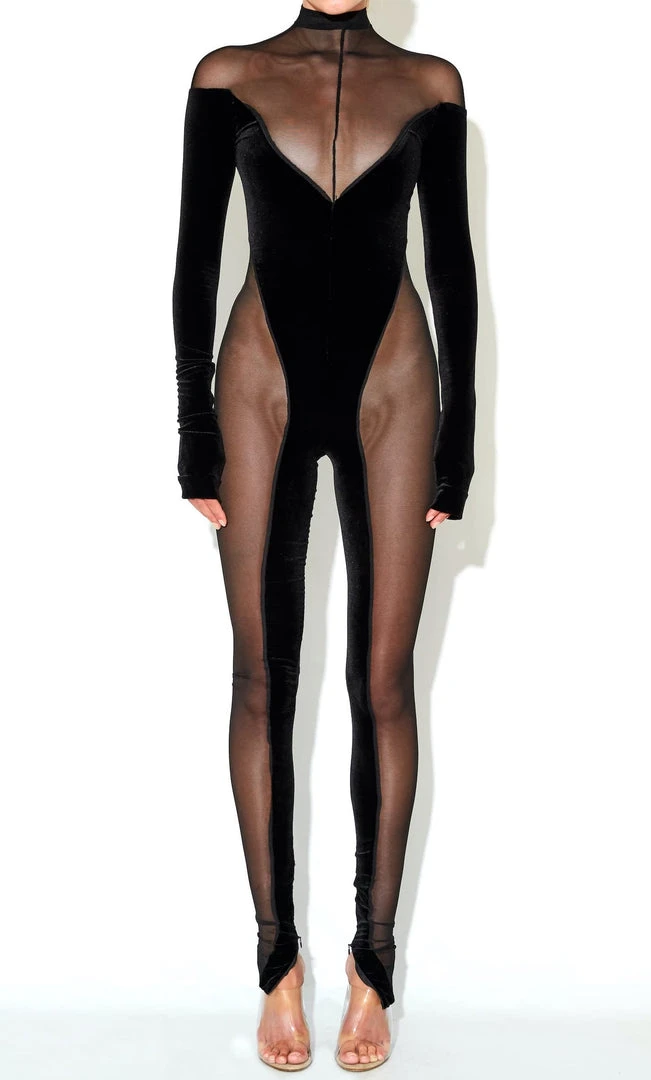 LaQuan Smith shows off his distinctive design aesthetic with this semi-sheer abstract panelled catsuit. Presented in black, it features softly textured velvet panels alongside and a high neckline.