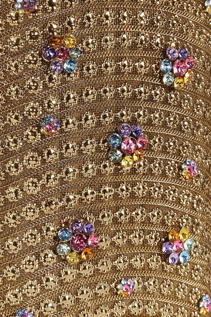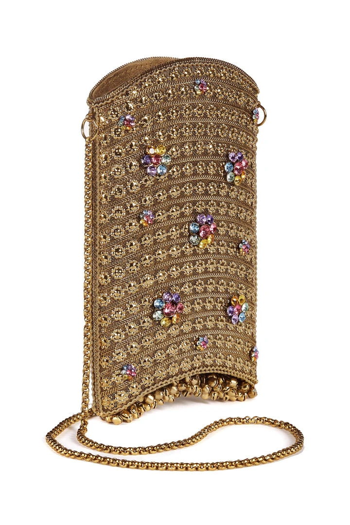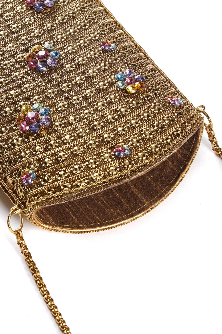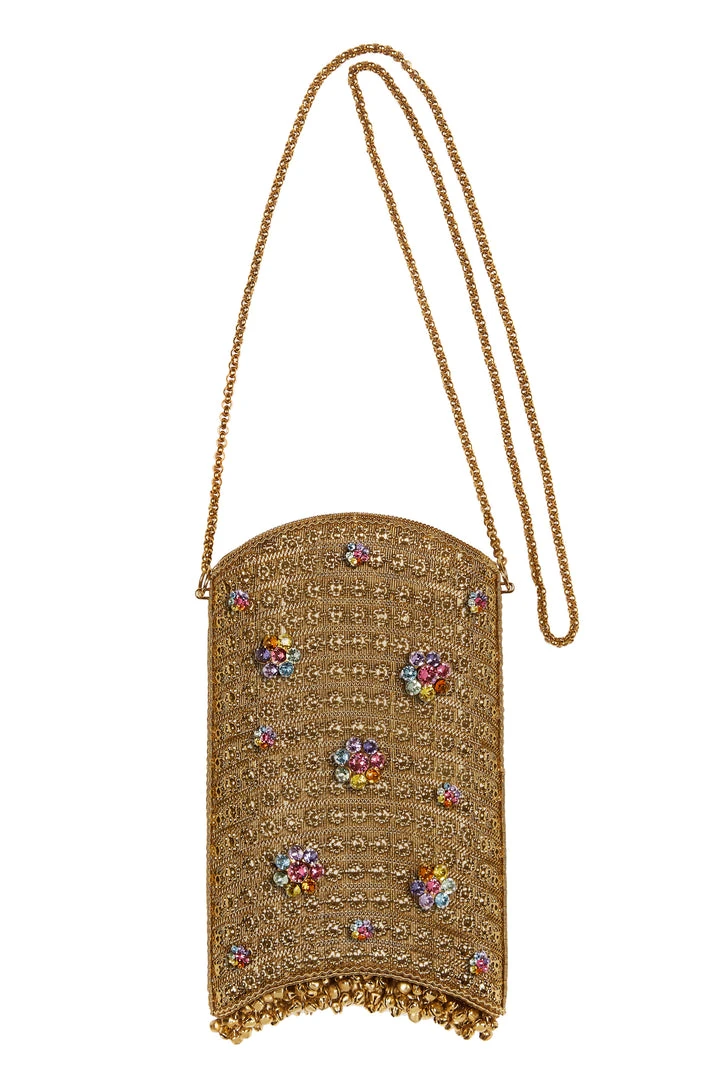 Embellished with handset, coloured Swarovski crystal flower detailing in shimmering rainbow hues and bell detailing. Each piece is handmade by a single skilled artisan, from intricate pieces of recyclable antique gold-tone metalwork, welded together in a structured curved shape, with handmade chain.