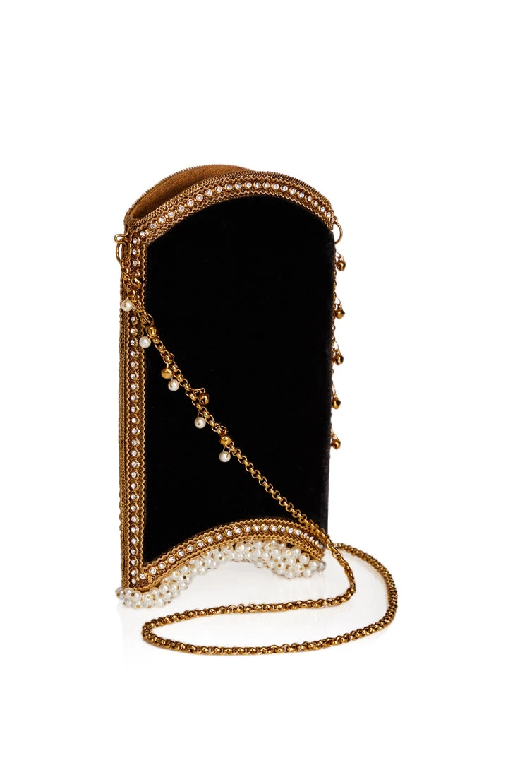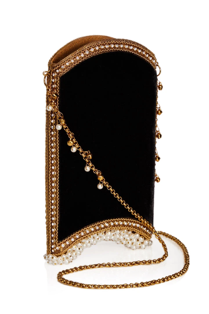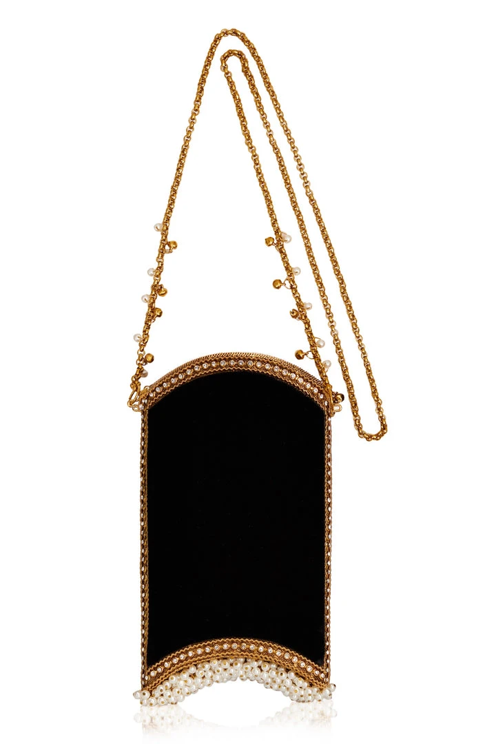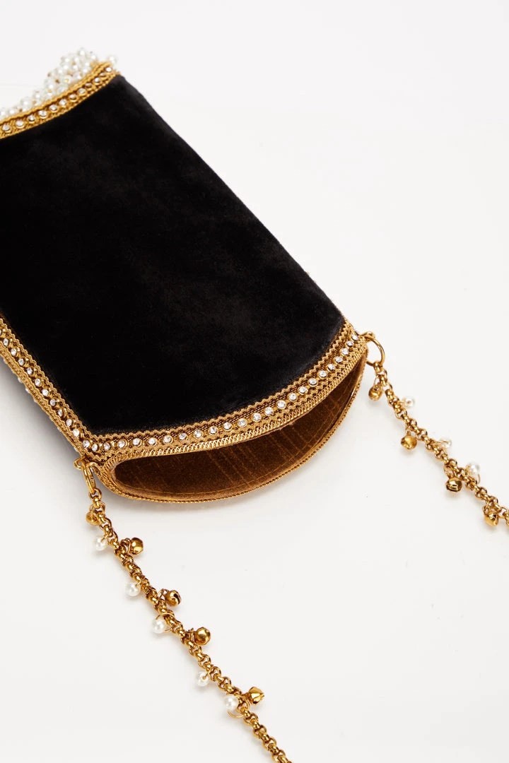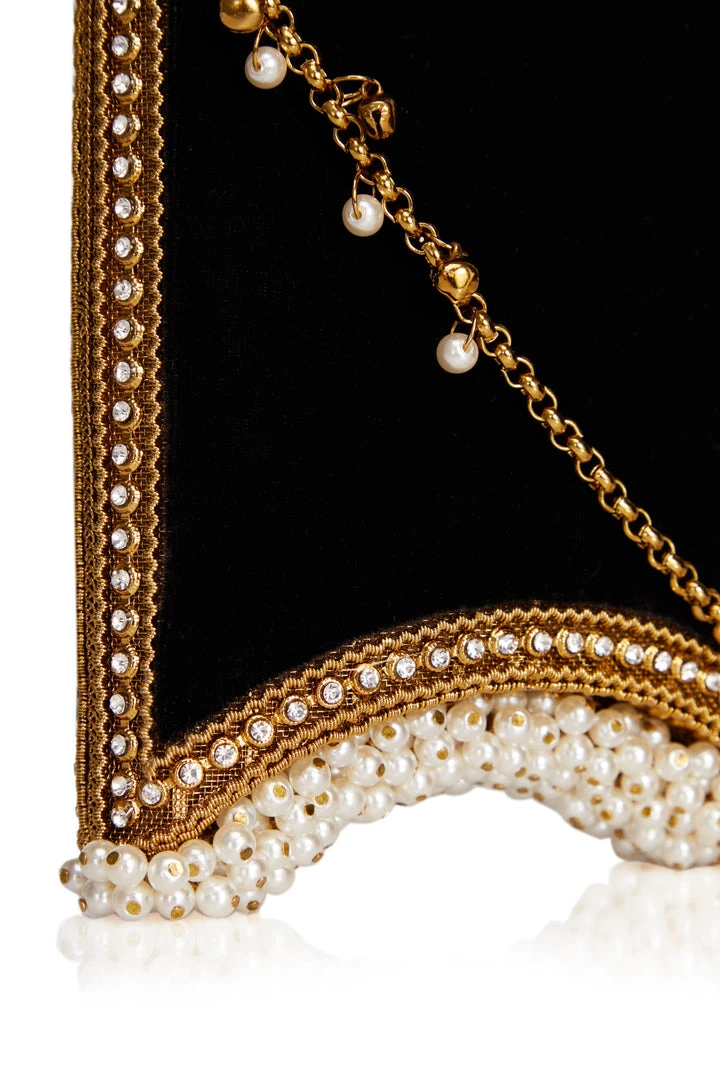 Each piece is handmade by a single skilled artisan, from intricate pieces of recyclable antique gold-tone metalwork, welded together in a structured curved shape, with handmade chain. Contrasted by plush black velvet panels. Embellished with scores of shimmering crystals, bells and oh-so pretty pearl chain detailing and over 200 pearls hand-threaded onto gold-tone pins.