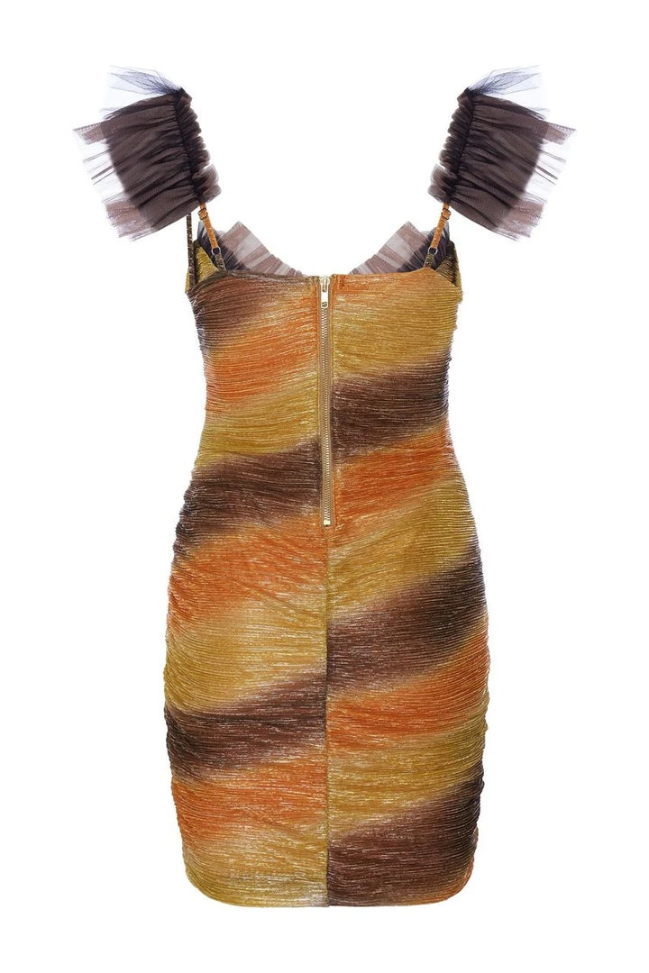 A stretchy metallic plissé mini dress with ruching throughout. Spiky black and taupe tulle tufting appears on the shoulder, along the neckline and down the bodice. Fabricated in a gold-flecked rayon lurex fabric, with abstract yellow, orange and taupe stripes. Made in New York City