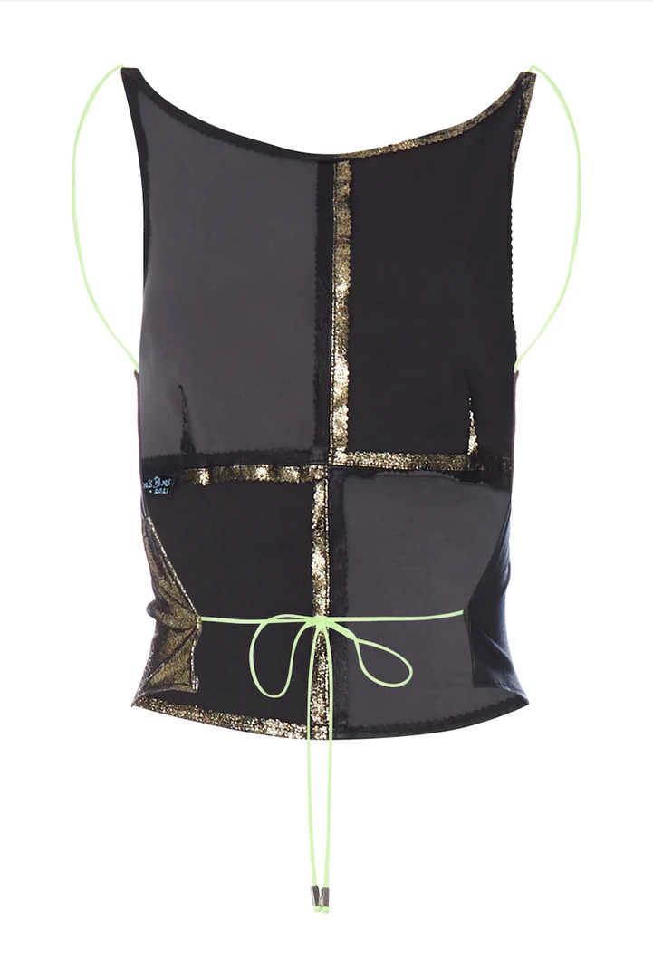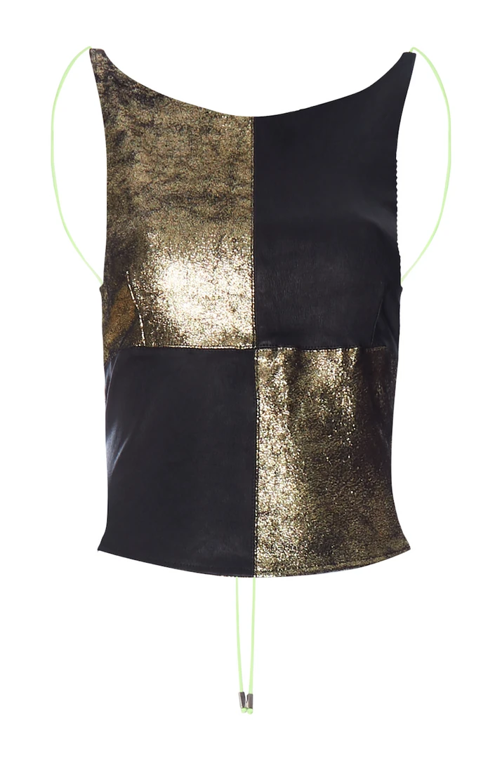 Custom made checked brushed bronze metallic and black suede top; green elastic string ties
