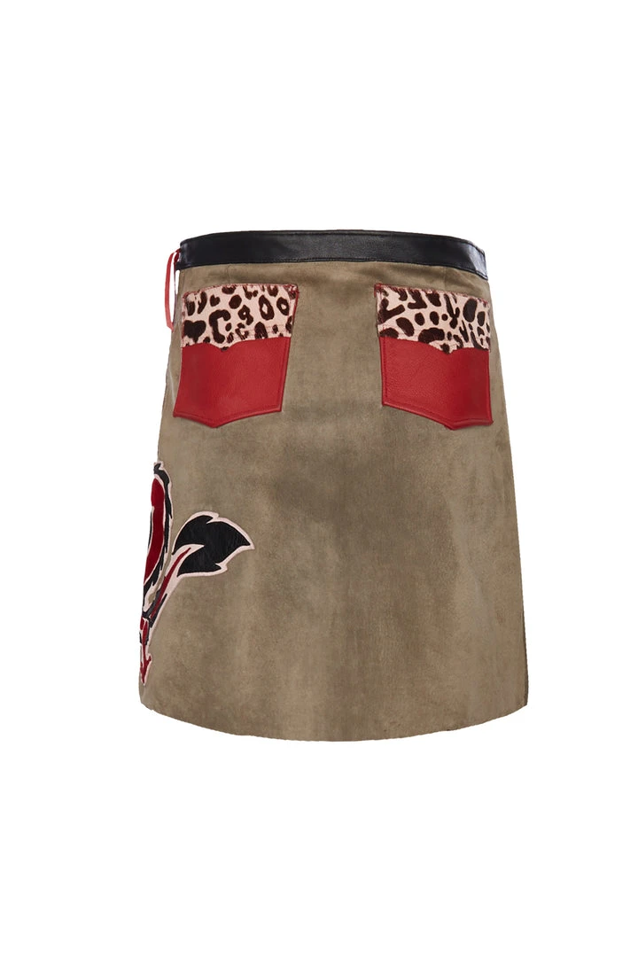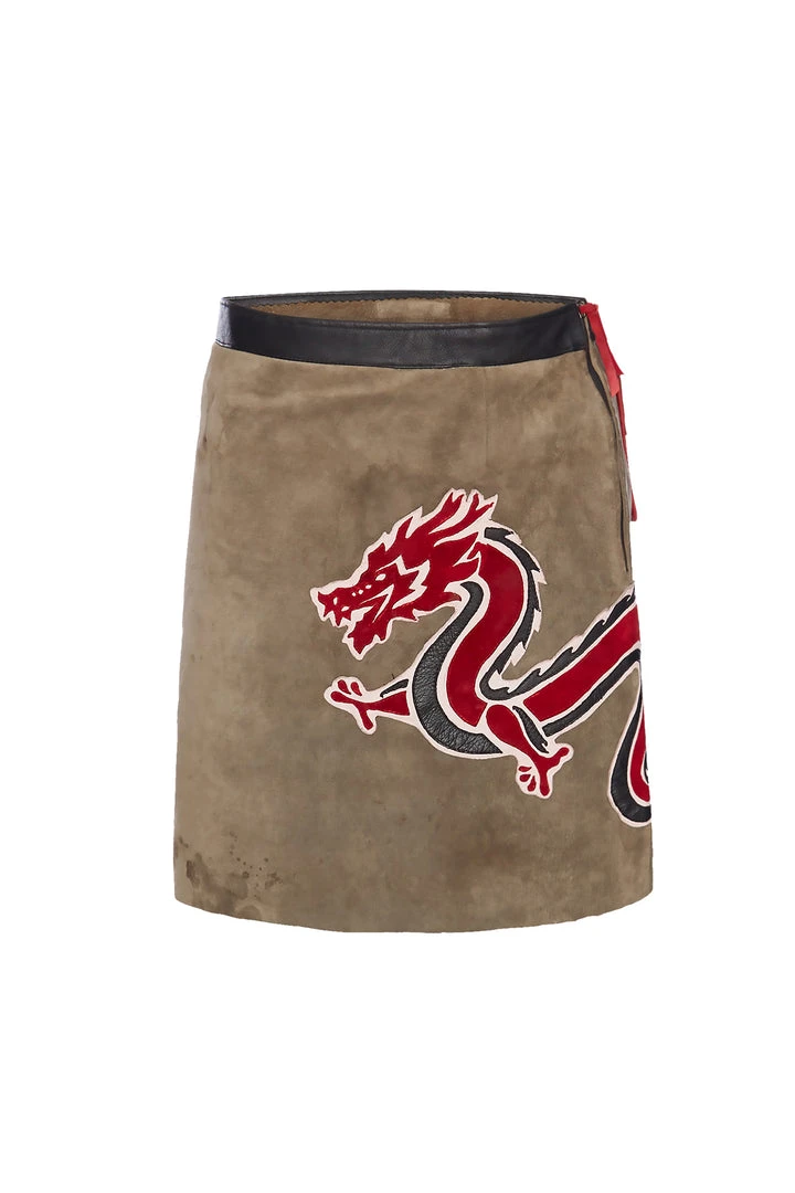 Custom made brown suede mini skirt with appliquéd Chinese dragon; leopard print pockets; up cycled and sustainable fashion; one-of-a-kind piece
